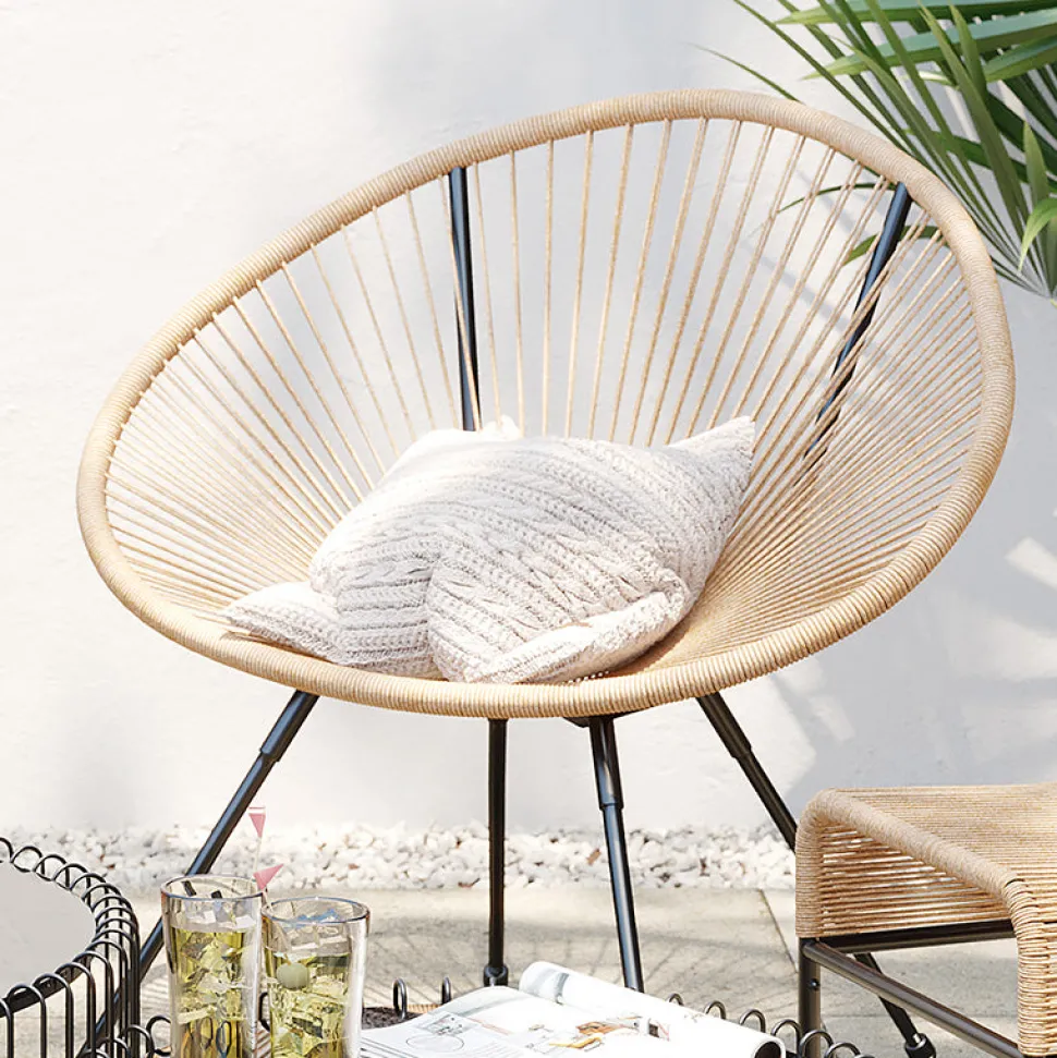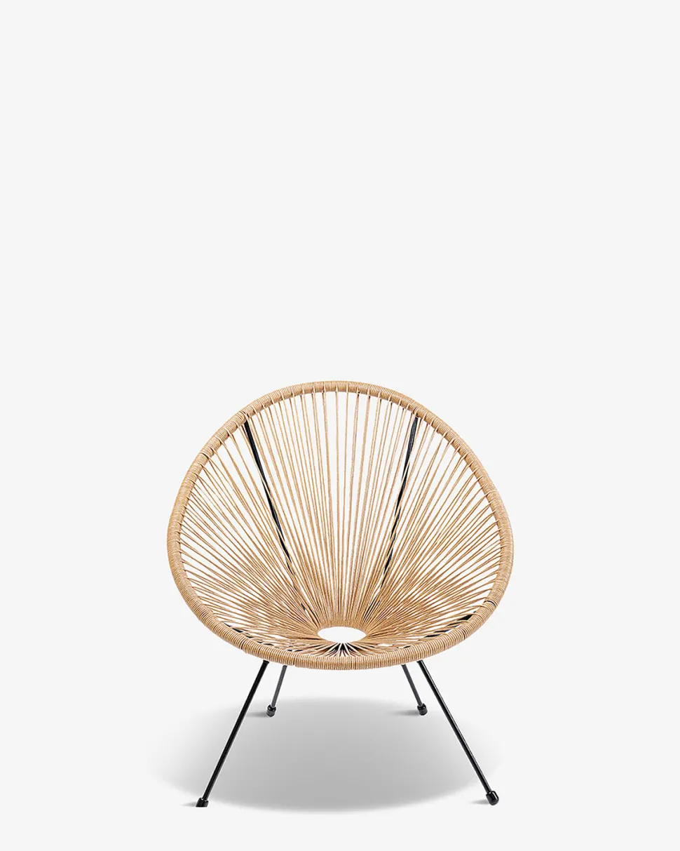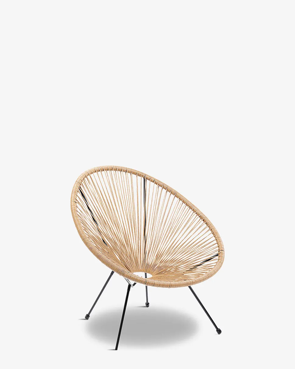 Designerstol egnet til udendørs brug i naturfarve med sort stel, til terrassen, haven og altanen.