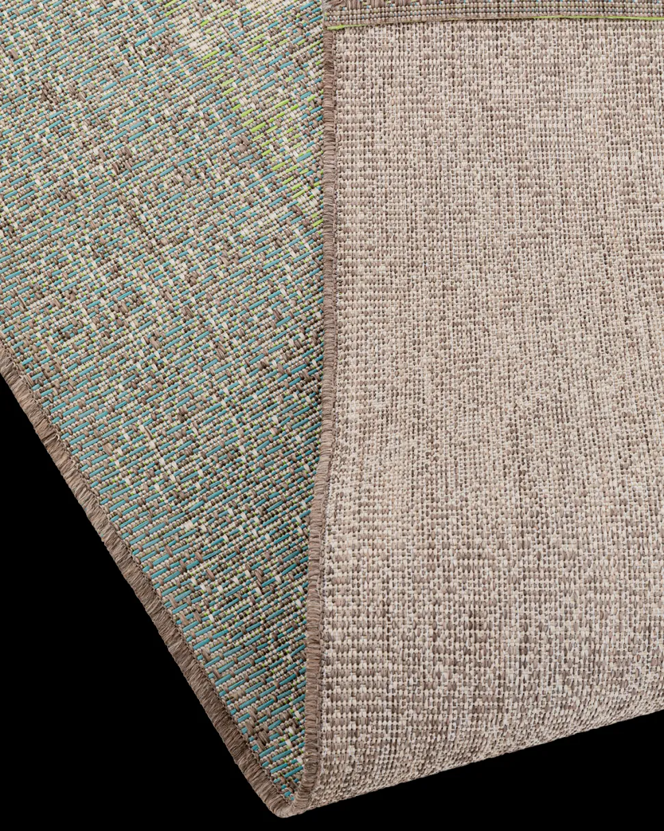 Tæppet er fremstillet i robust polypropylen, der tåler intensiv brug og er let at vedligeholde. Den skridsikre gummibagside sikrer stabil placering på både terrasse og gulv.
