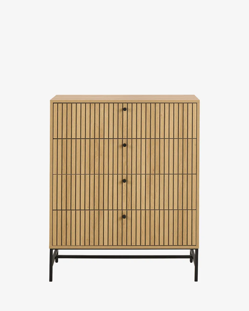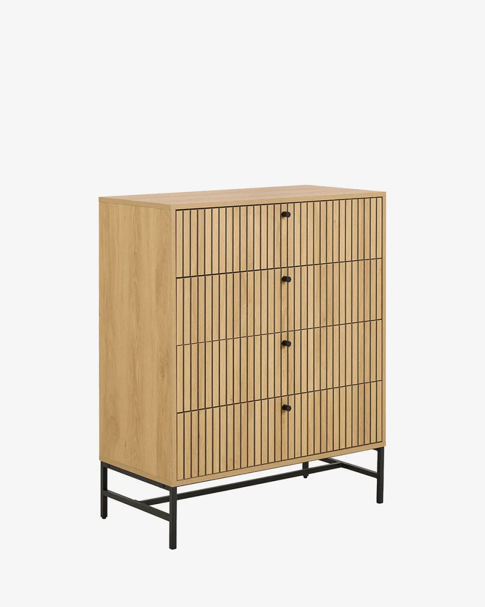 Den sorte metalramme giver et let og personligt præg, der skaber en flot kontrast til det naturlige trælook. Kommoden passer perfekt i soveværelset, entreen eller stuen – og kombinerer funktionalitet med tidløst design.