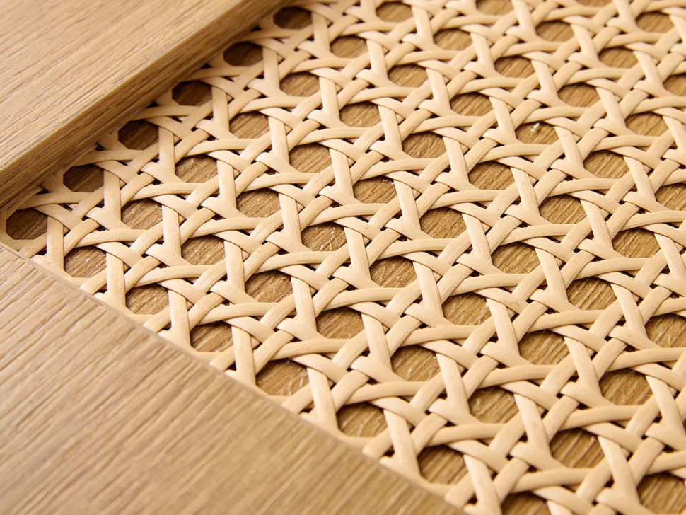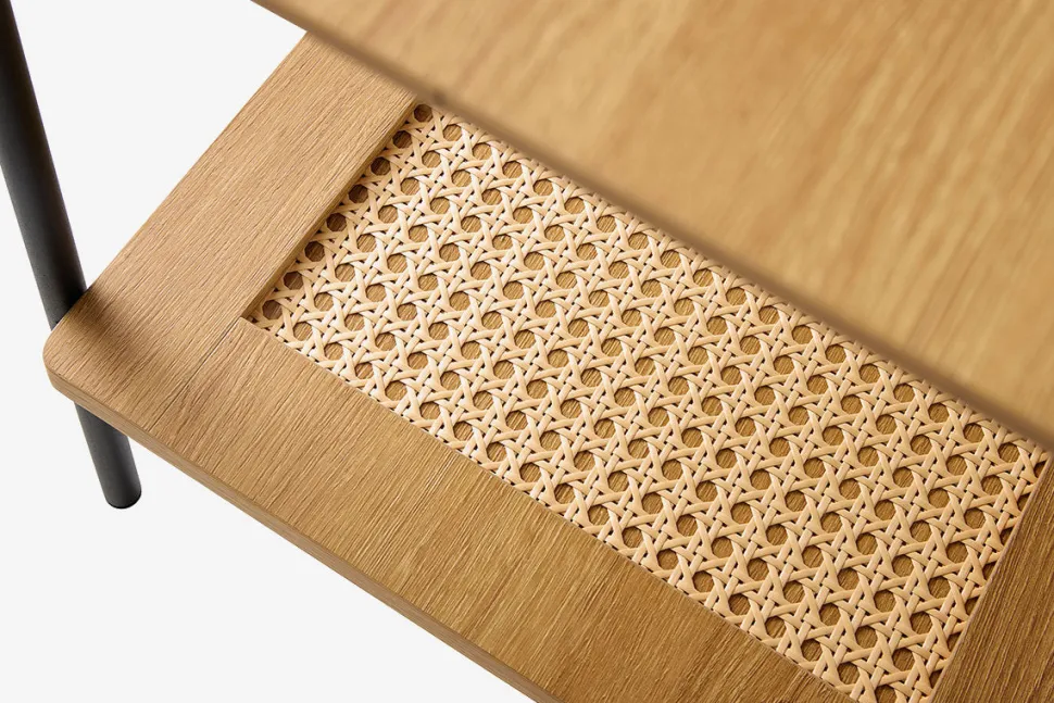 Under bordpladen er der en praktisk hylde med fransk flet, som giver ekstra opbevaringsplads til småting, bøger eller dekorationer. De sorte metalben skaber en flot kontrast til den naturfarvede overflade og giver bordet et let og luftigt udtryk.