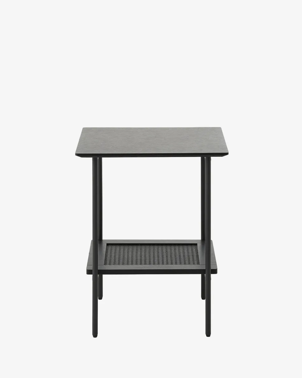 Hylden med fransk flet giver praktisk opbevaringsplads uden at gøre bordet visuelt tungt. De sorte metalben fuldender det minimalistiske design og gør hjørnebordet nemt at placere i både stue, soveværelse eller entré.