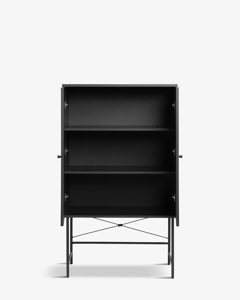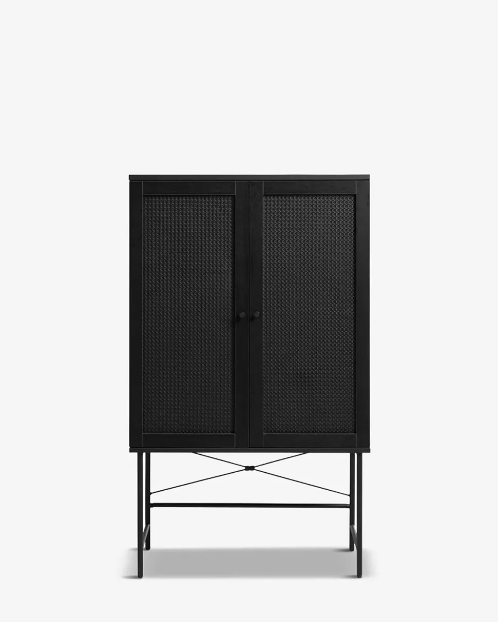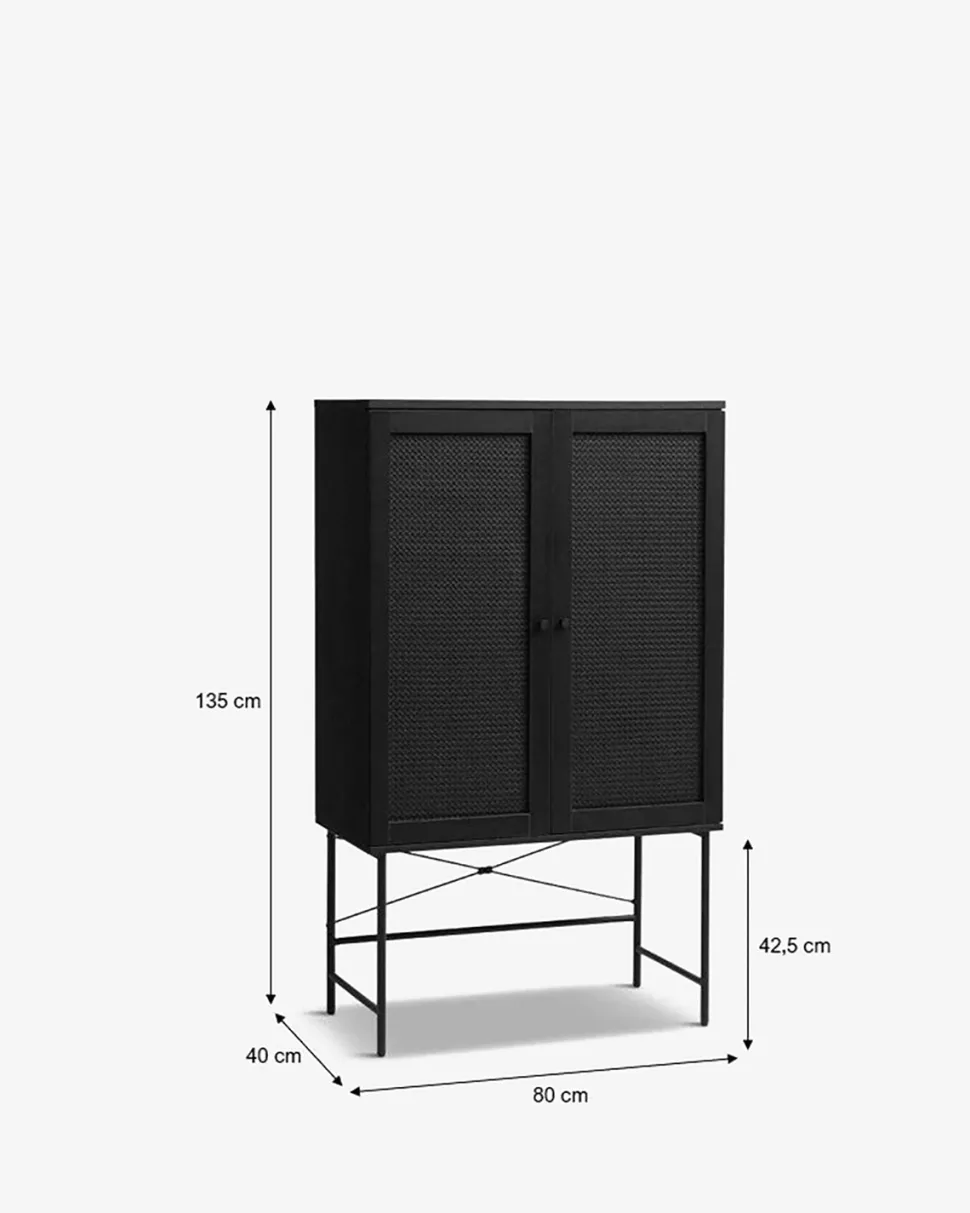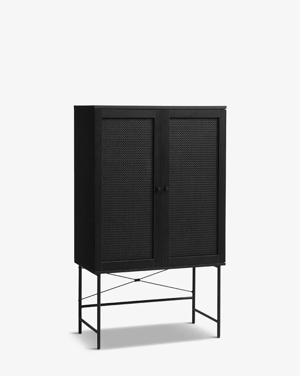 Skænken har to låger der er udformet med bøjet polyrattan der danner et smukt mønster på forsiden af begge låger. Bag lågerne er rummene inddelt med to hylder, så der er god opbevaringsplads. De høje slanke ben er med til at give skænken et let udtryk.