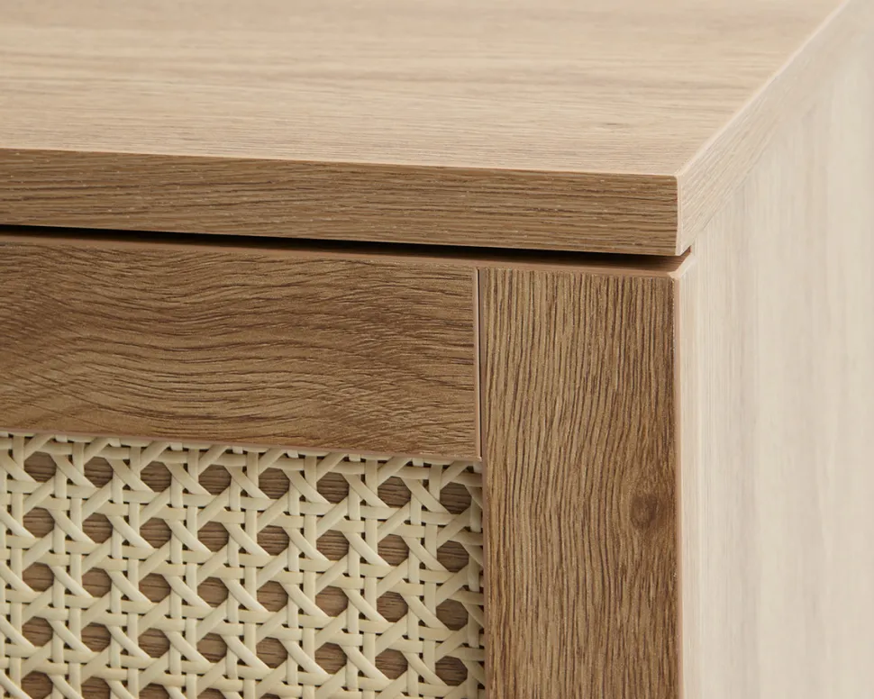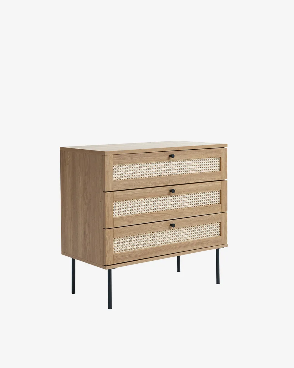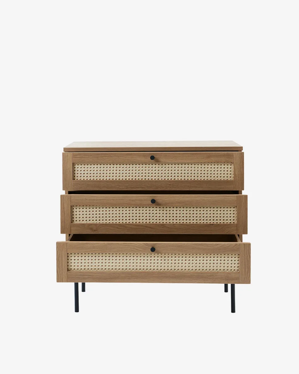Alva kommoden er en del af Alva-serien og kombinerer et let, minimalistisk design med varme naturdetaljer. De franske fletfronter på skufferne giver kommoden et levende og indbydende udtryk, mens de sorte metalben tilfører et moderne og let løft.