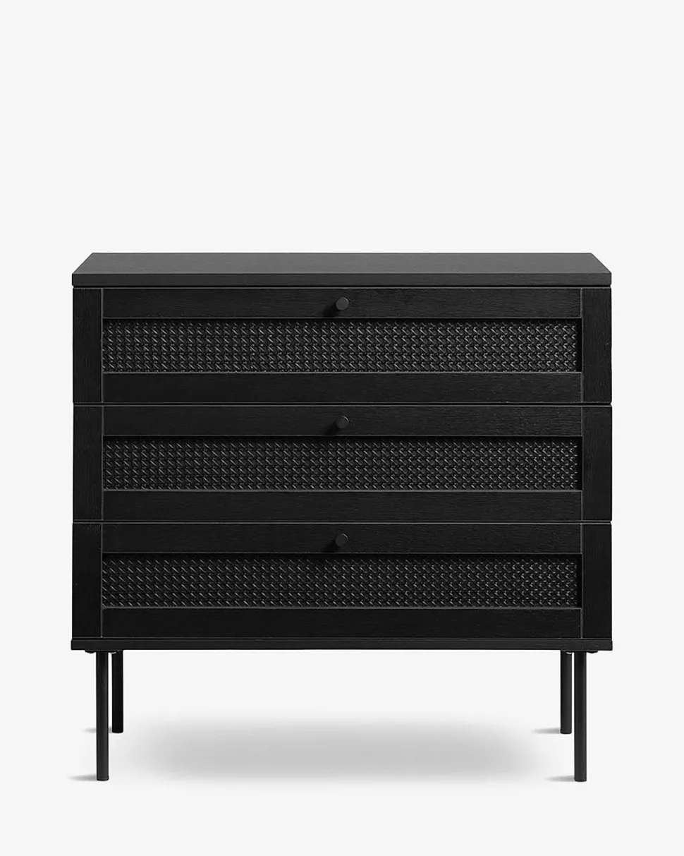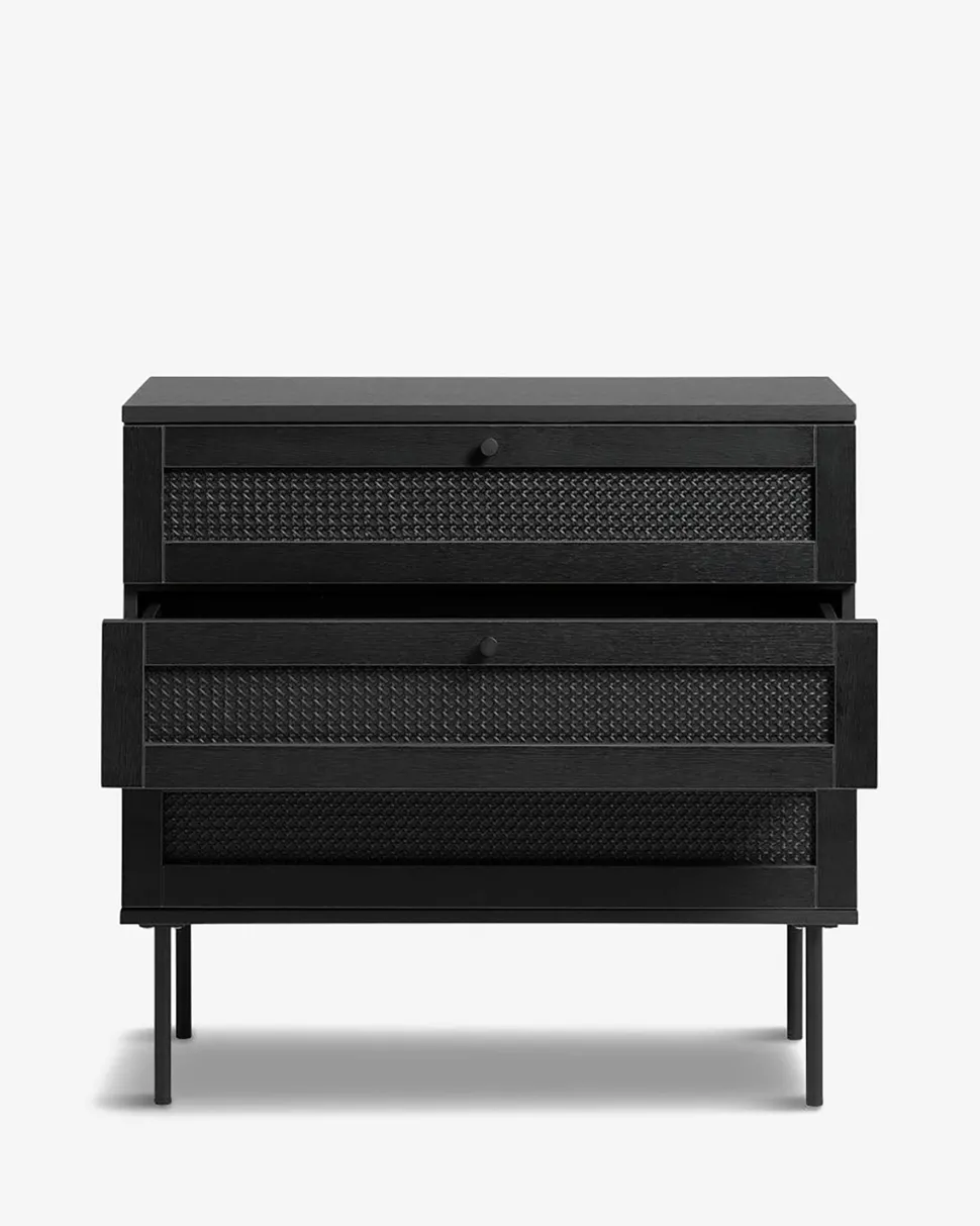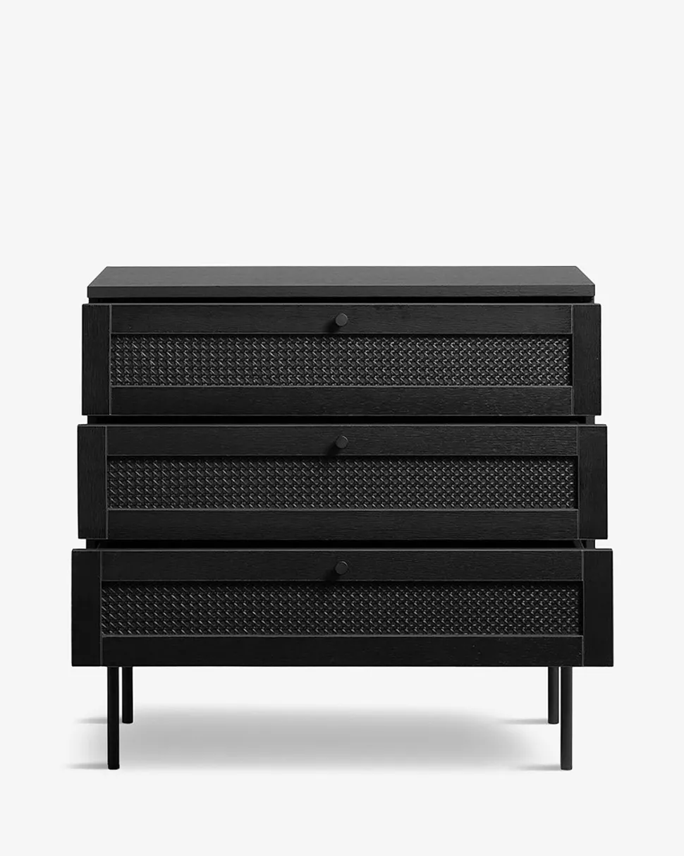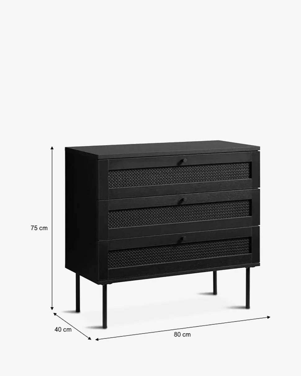 Alva kommoden er rigtig flot og moderne i sit look. Den har tre store skuffer, og fronten på skufferne er beklædt med polyrattan i et flot mønster der gør kommoden meget dekorativ.