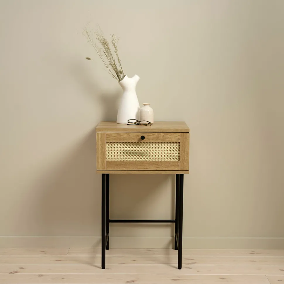 Alva sengebordet er en del af Alva-serien og forener et let, nordisk udtryk med dekorative naturdetaljer. Den franske fletfront på skuffen tilfører varme og karakter, mens det sorte metalstel giver møblet et moderne og luftigt look.