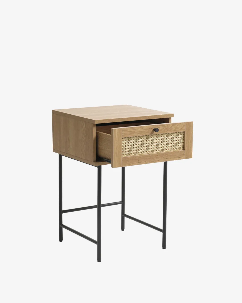 Alva sengebord – let og nordisk med fransk flet. Sengebord med 1 skuffe og sort metalstel i naturfarve.