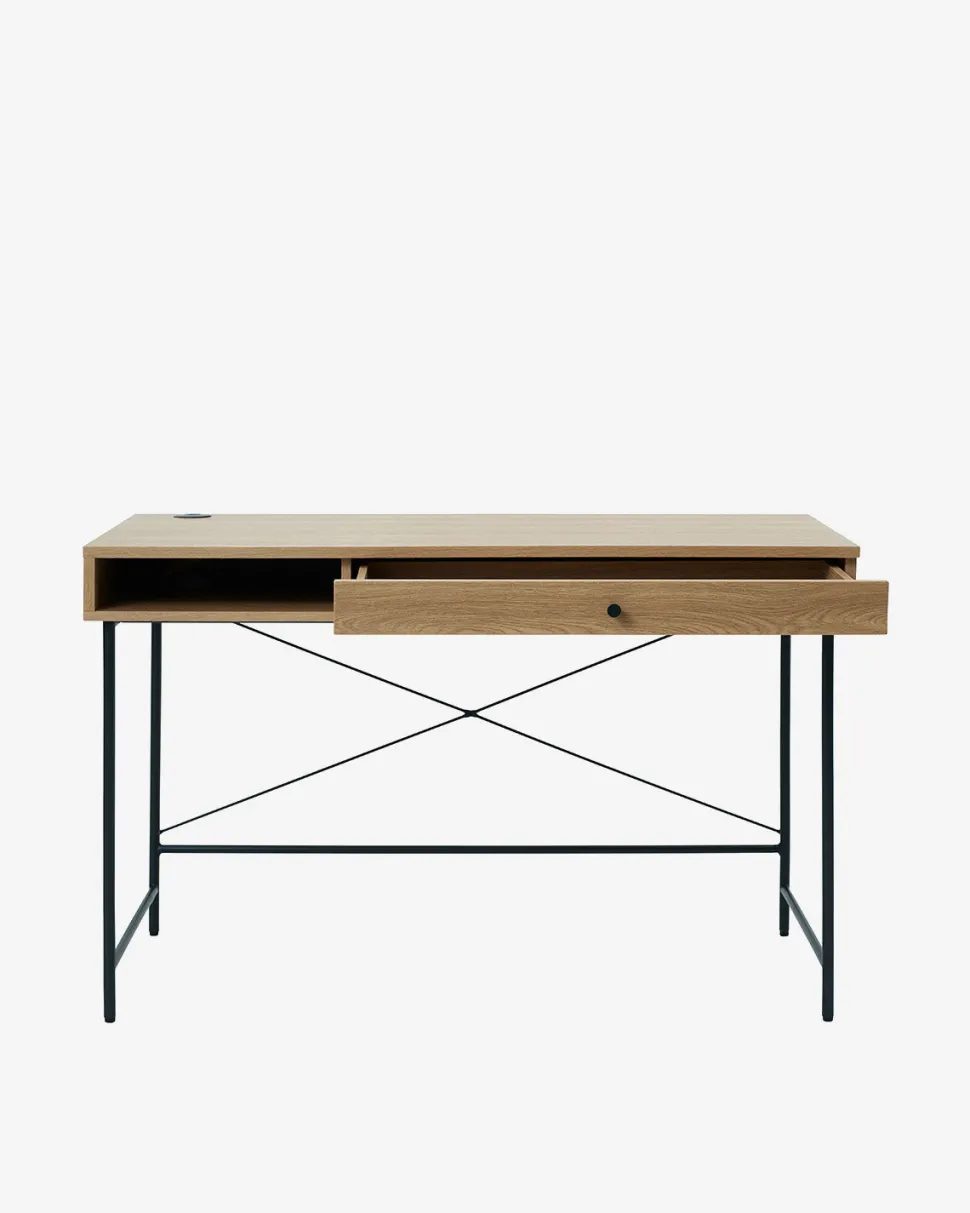 Alva skrivebord – let og minimalistisk arbejdsplads. Skrivebord med skuffe, åbent rum og kabelgennemføring i natur/sort design.