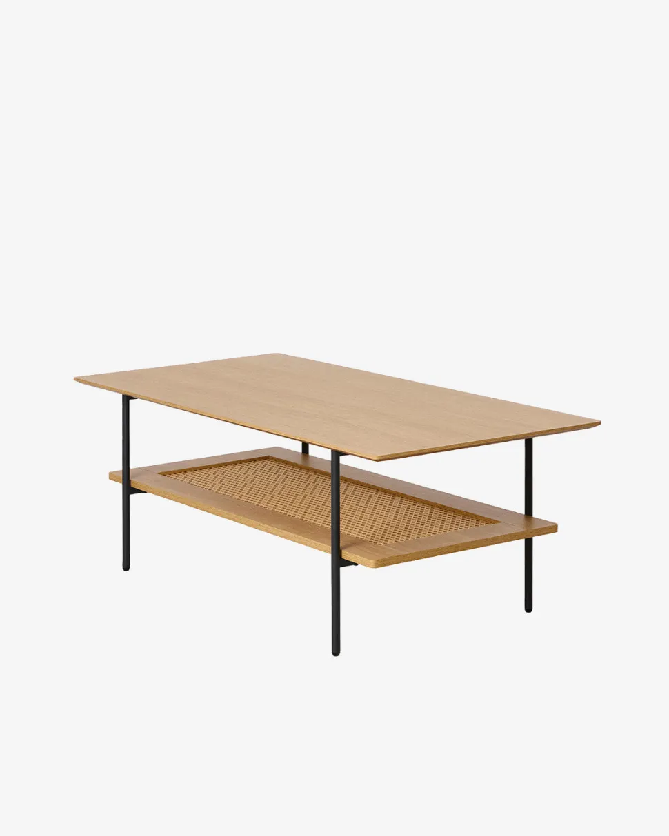 Under bordpladen er der en praktisk hylde med fransk flet, som giver ekstra opbevaringsplads til magasiner, bøger eller andre hverdagsgenstande. De sorte metalben skaber en flot kontrast og giver bordet et let og luftigt look.