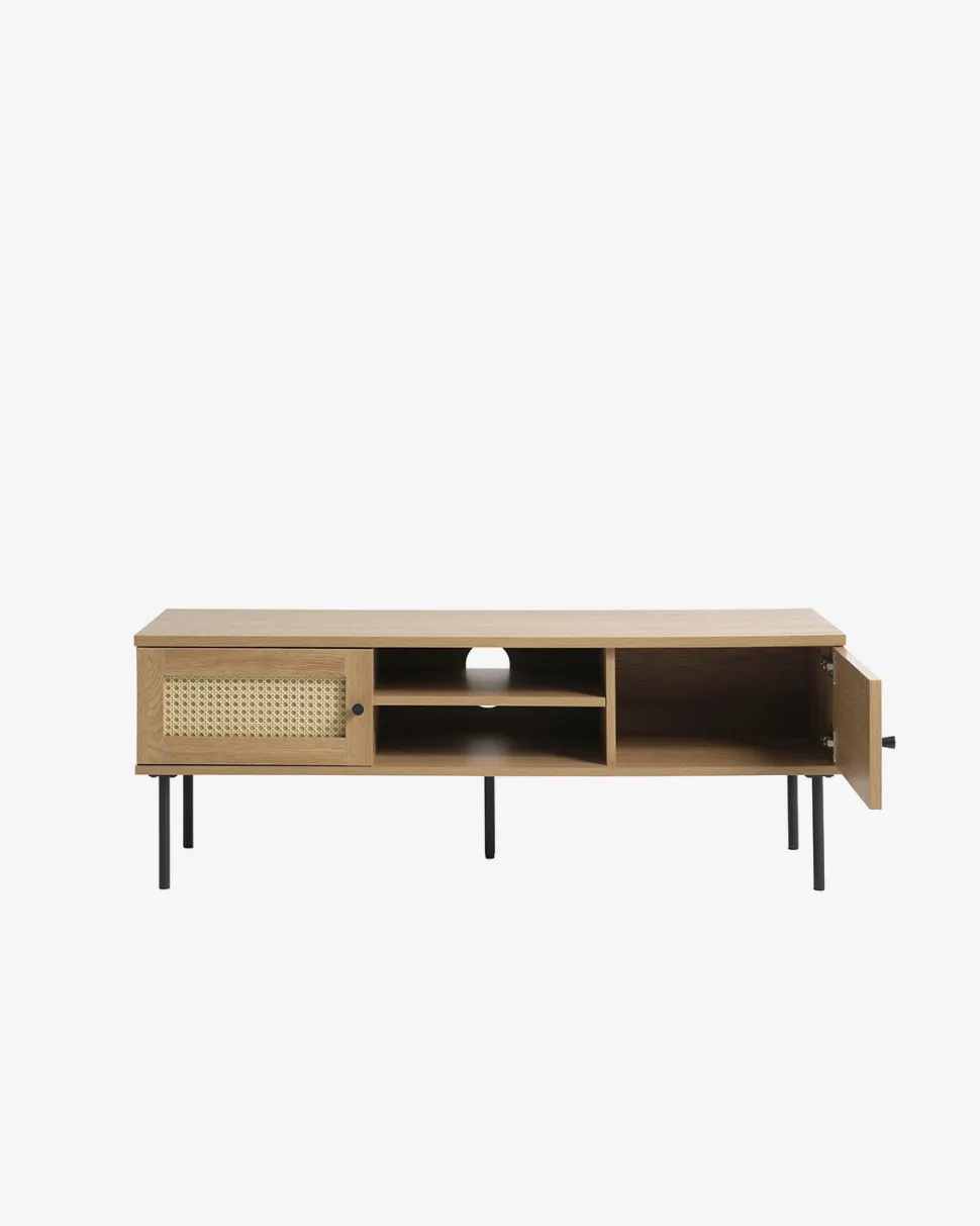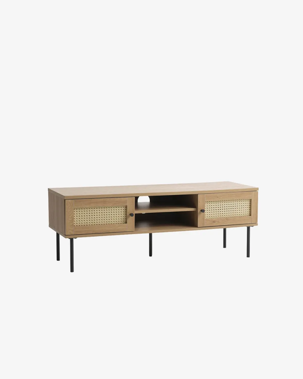 Alva tv-bord – let og funktionelt med fransk flet. Tv-bord med 2 låger, åbent rum og sorte metalben. B.120 cm.