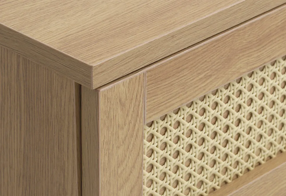 Alva tv-bordet er en del af Alva-serien og kombinerer et minimalistisk udtryk med dekorative detaljer. De franske fletfronter på lågerne tilfører varme og karakter, mens de sorte metalben giver møblet et let og moderne løft.