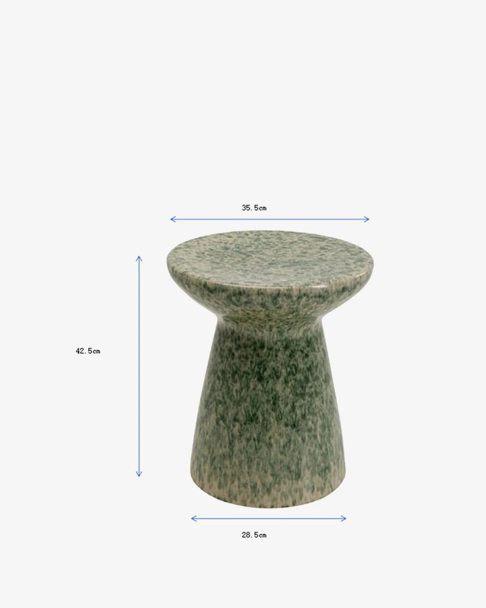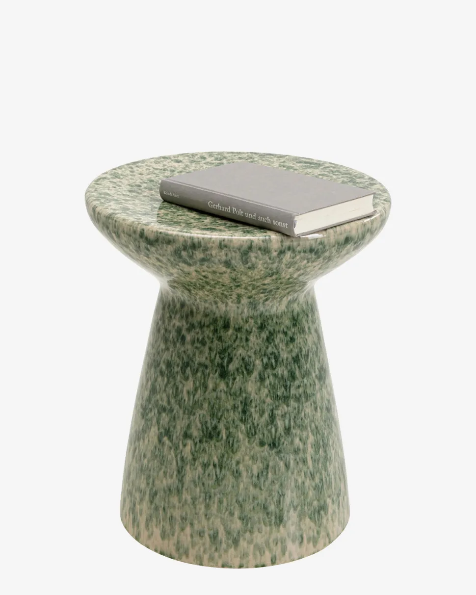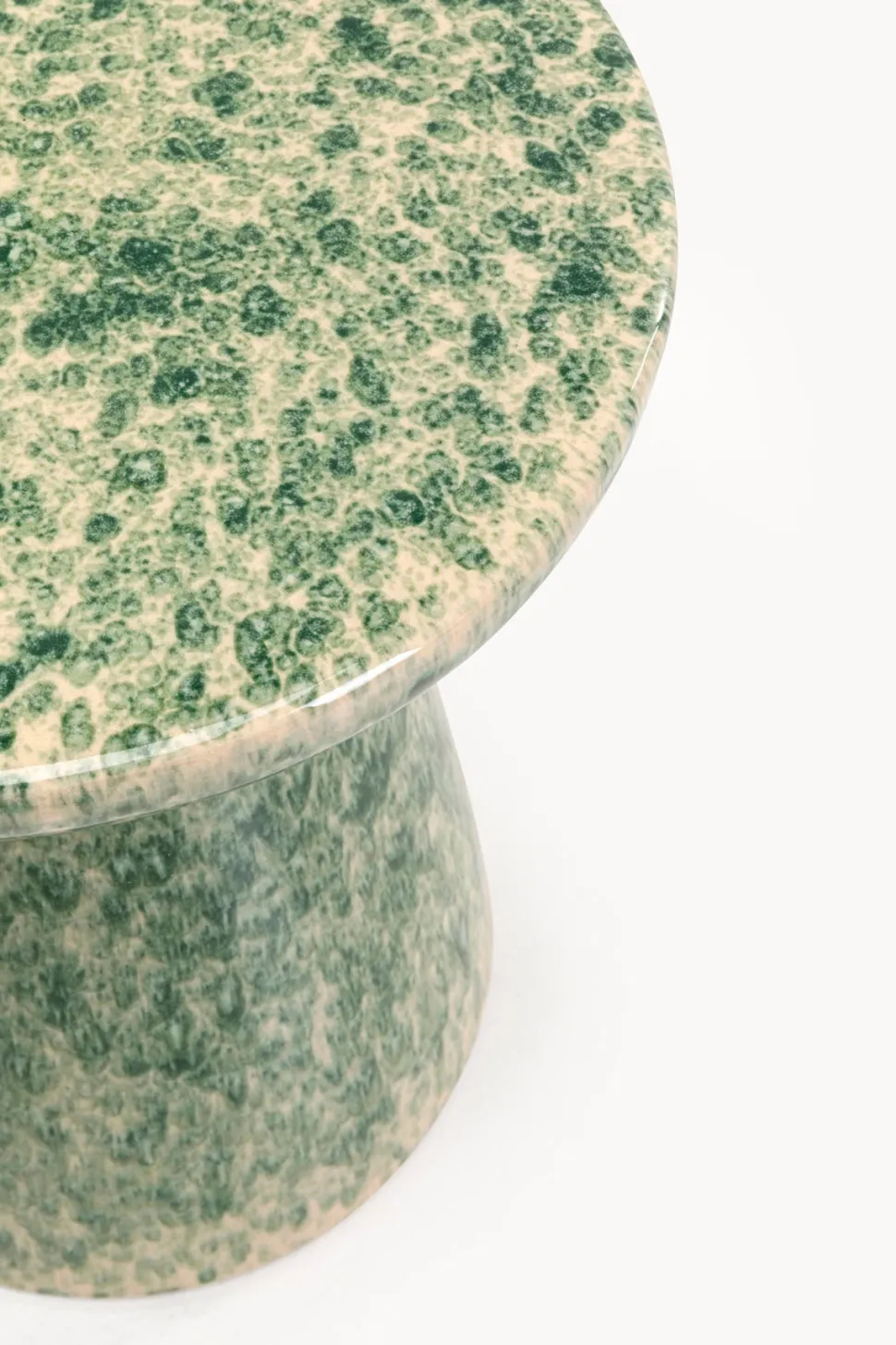 Arrivato sidebordet er et dekorativt og funktionelt bord i grøn glaseret keramik med et smukt spættet mønster, der giver bordet et levende og naturligt udtryk. Den glaserede overflade fanger lyset flot og gør hvert bord unikt i sit farvespil.