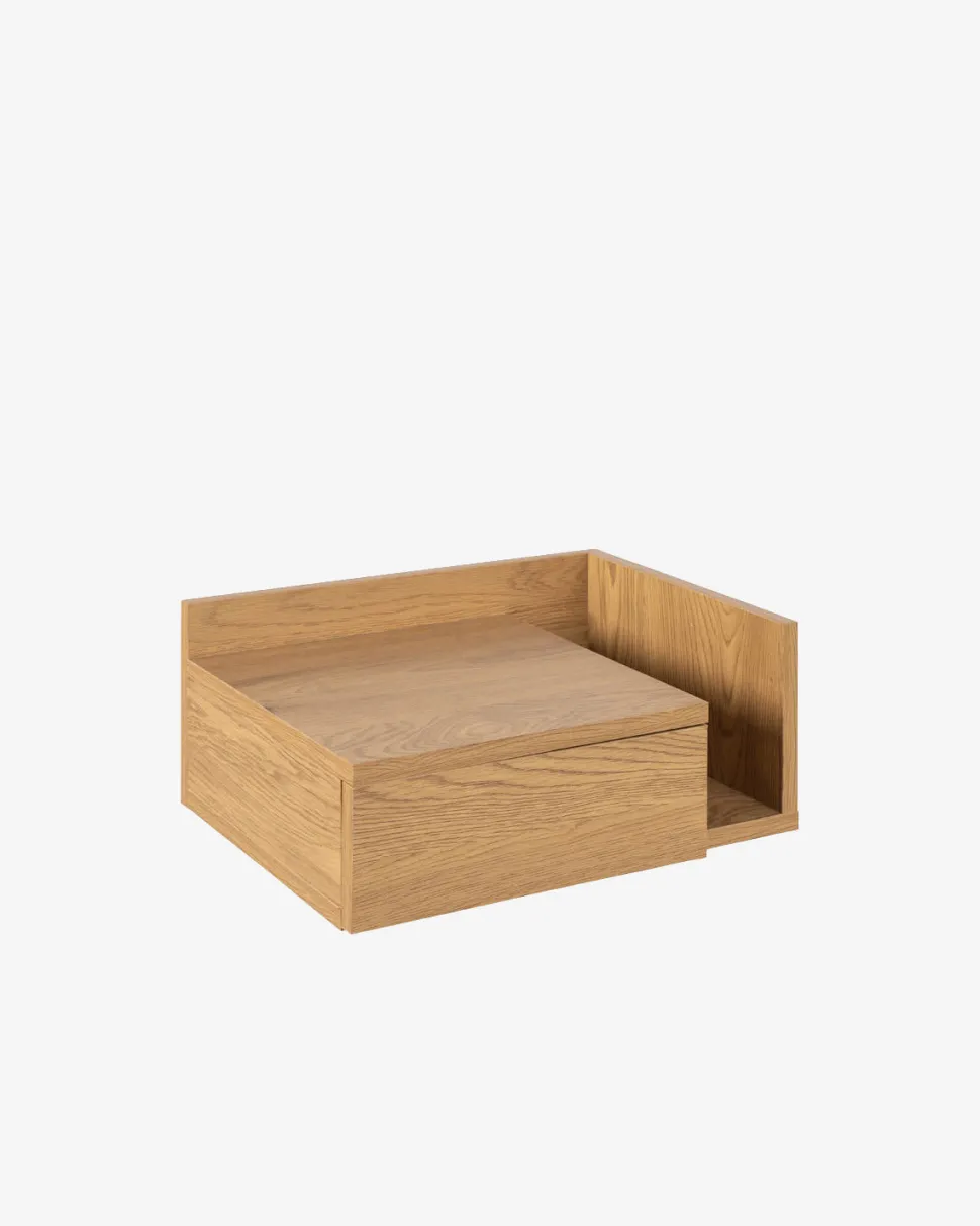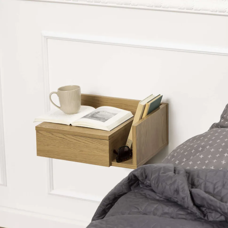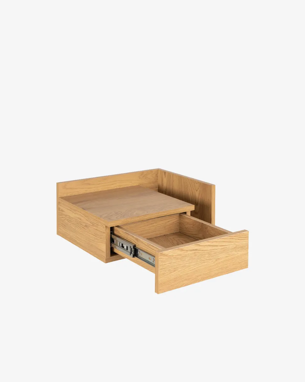 Aslan sengebordet er en væghængt løsning, der giver et let og moderne udtryk i soveværelset. Det er udført i eg papirfolie og har både en skuffe og et åbent rum – perfekt til opbevaring af bøger, tablets eller opladere.