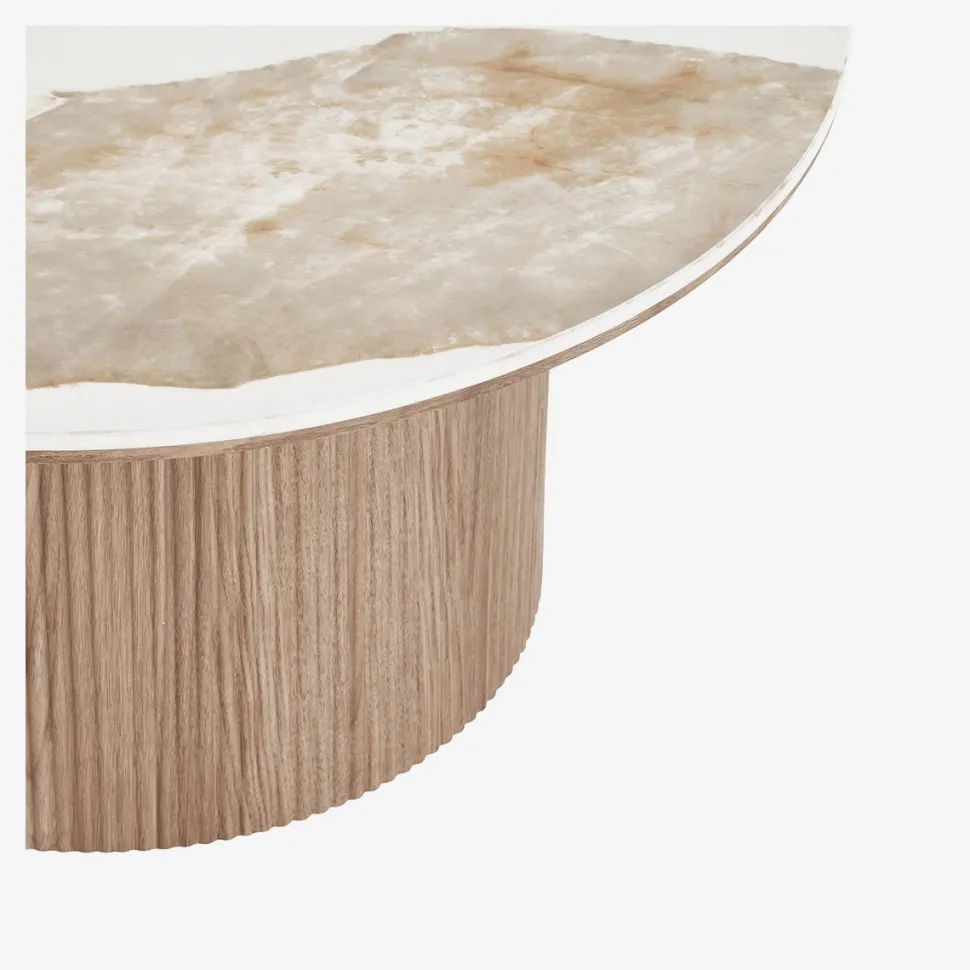 Understellet er udført i en varm, naturfarvet træstruktur, som giver bordet en harmonisk kontrast mellem det lyse, elegante og det naturlige, organiske.