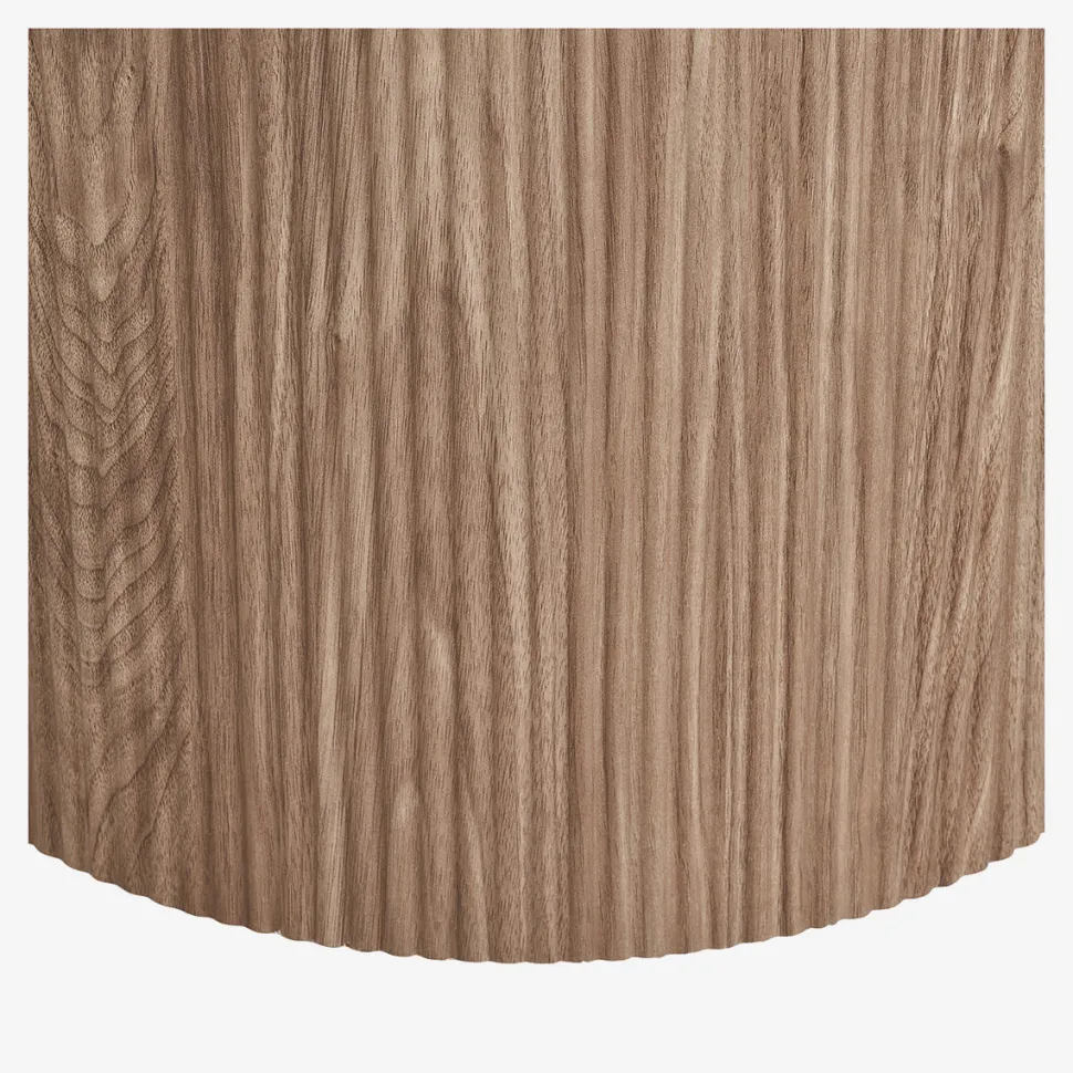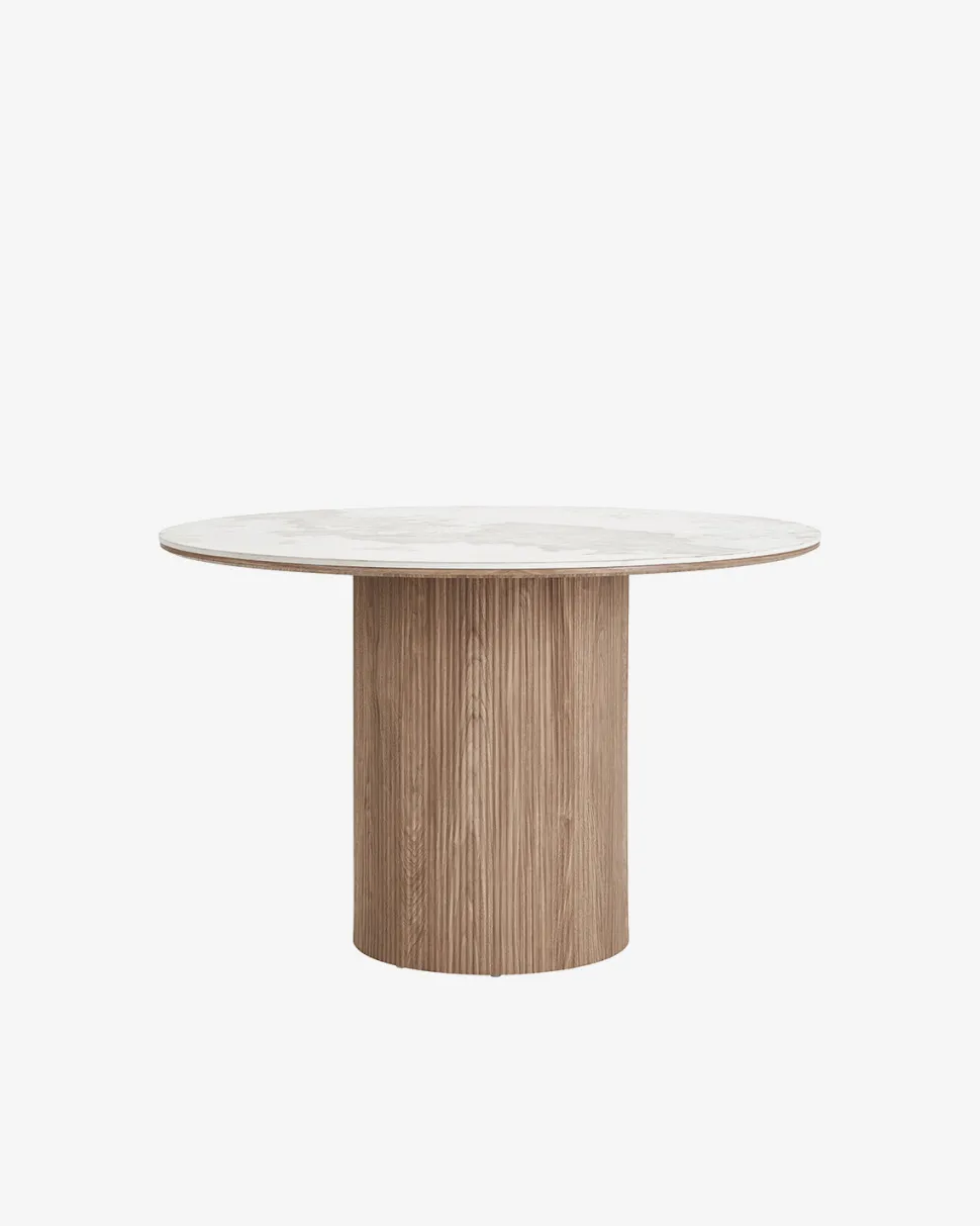 Den runde form skaber en social og indbydende stemning omkring bordet, hvor alle nemt kan samles. Bordet står på en rund sokkel med lamelriller i lys valnød farve, som tilfører varme og karakter. Stellet er udført i decopapir med en meget naturtro overflade og farve, der giver fornemmelsen af ægte træ kombineret med minimal vedligeholdelse.