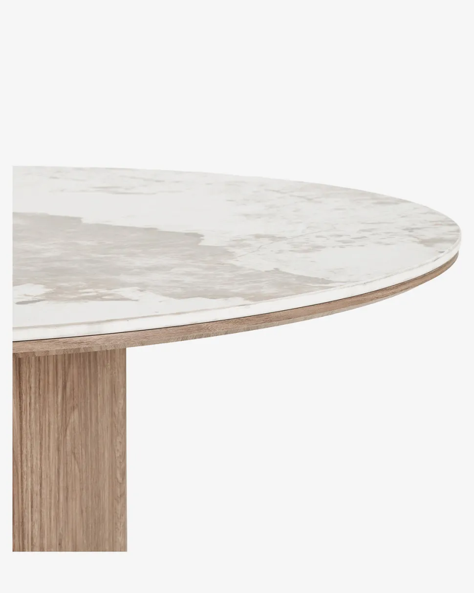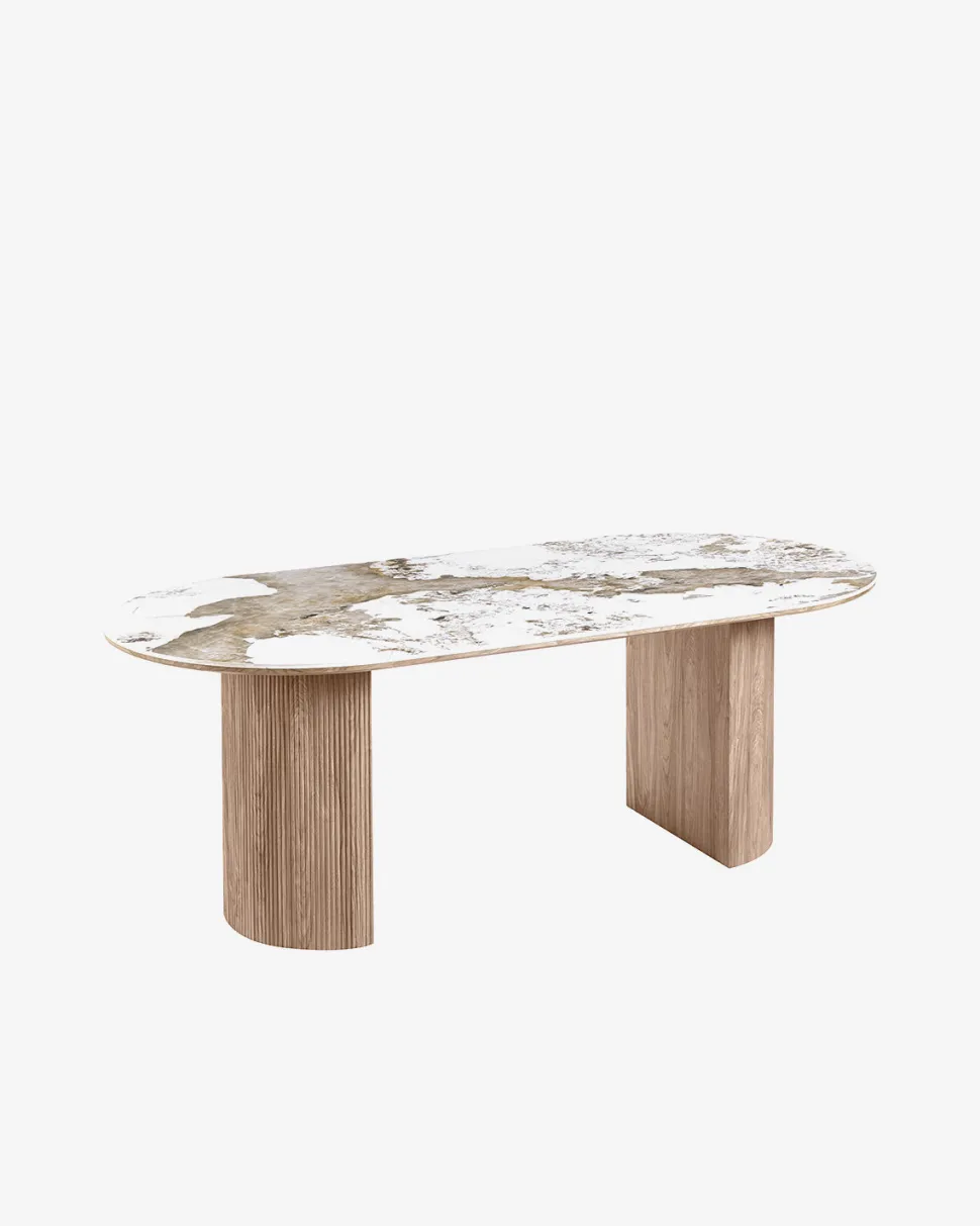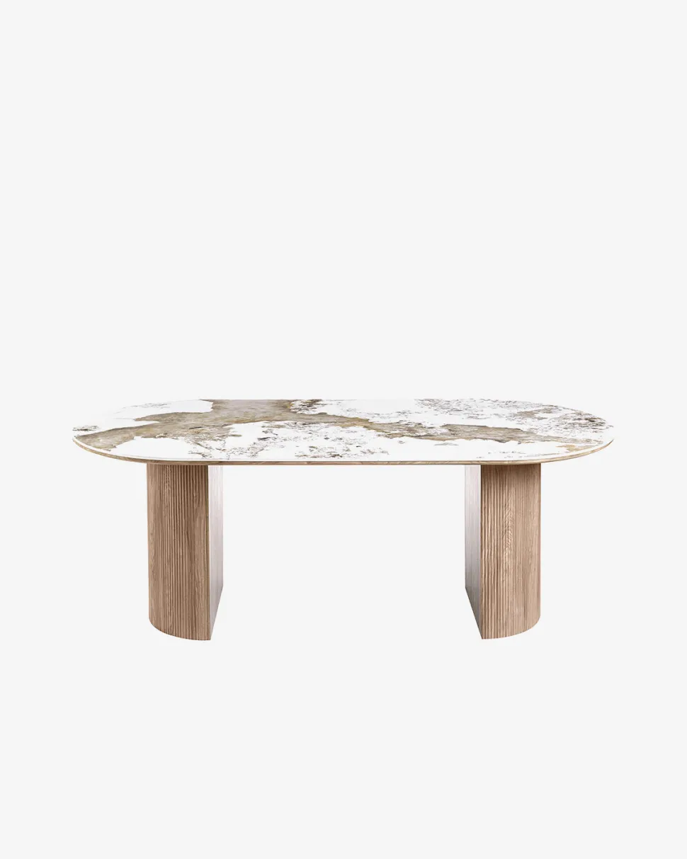 Athens spisebord – keramik med marmorlook og varm sokkel. Aflang ovalt spisebord med vedligeholdelsesfri keramisk bordplade. B.100 x L.210 cm.