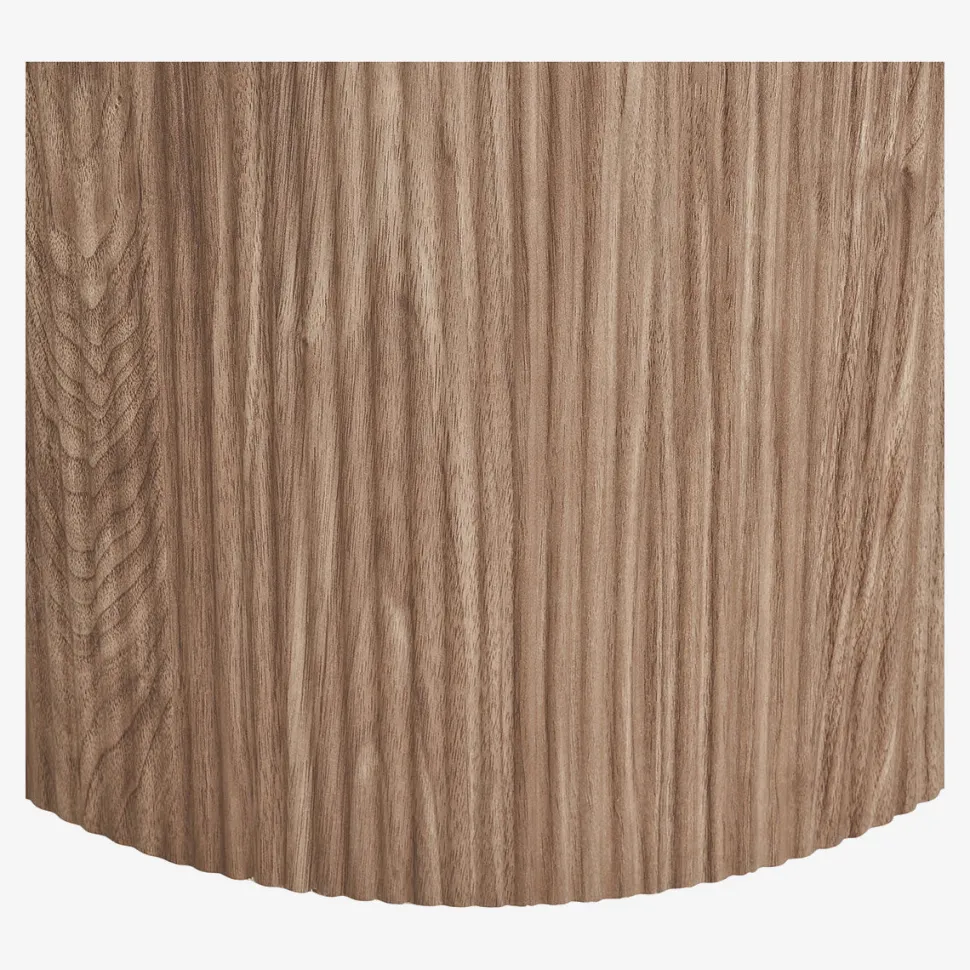 Det aflange, ovale design skaber et blødt og harmonisk udtryk i rummet og giver god plads omkring bordet. Soklen er udført med lamelriller i lys valnød farve, som tilfører varme og karakter. Stellet er lavet i decopapir med en meget naturtro overflade og farve, der giver fornemmelsen af ægte træ, samtidig med at det er let at vedligeholde.