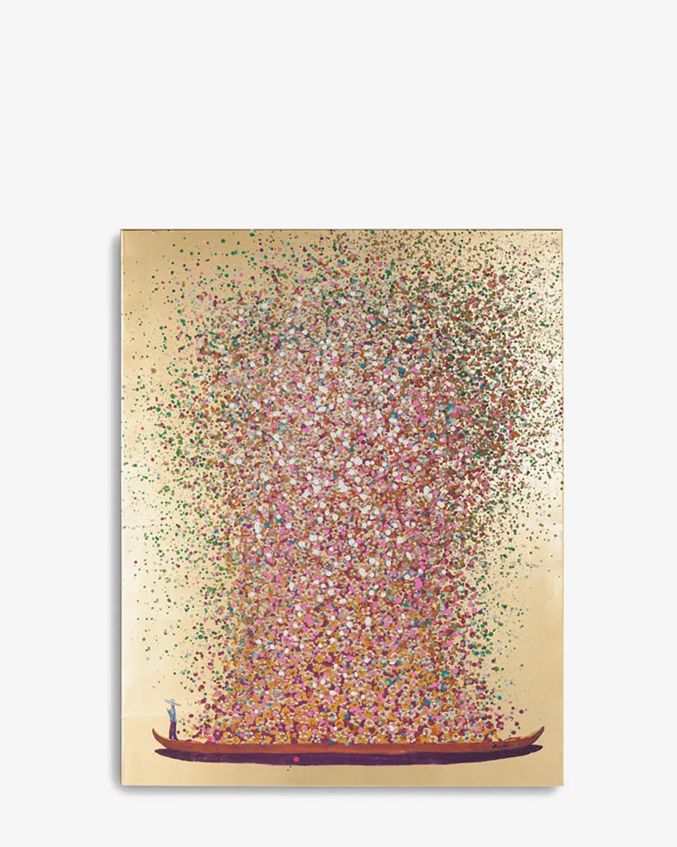 Skab opmærksomhed i rummet med denne båd fyldt med flotte lyserøde blomster malet på guldlærred.