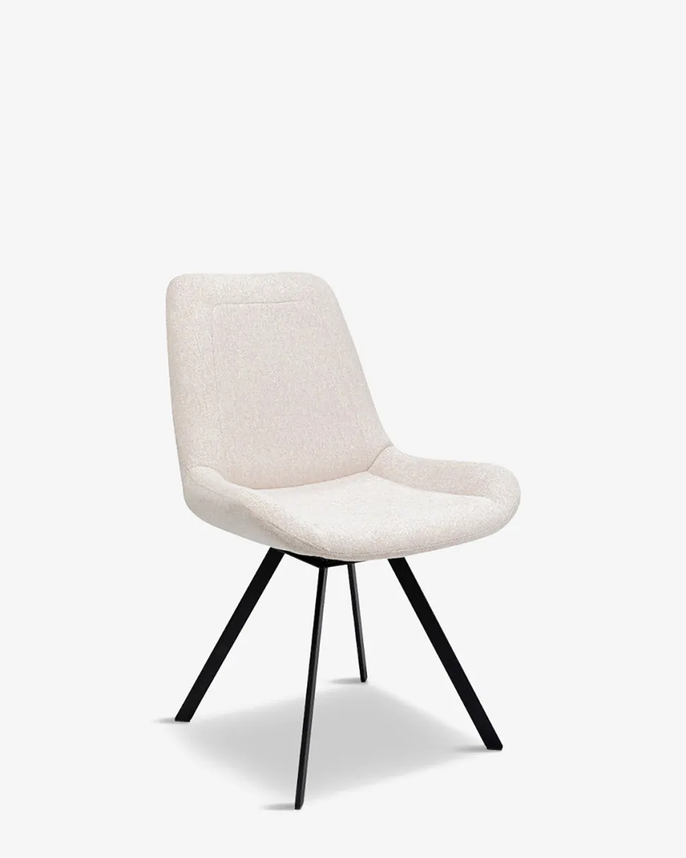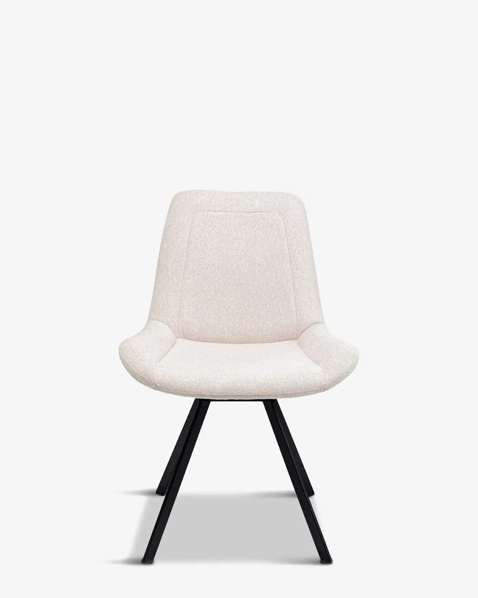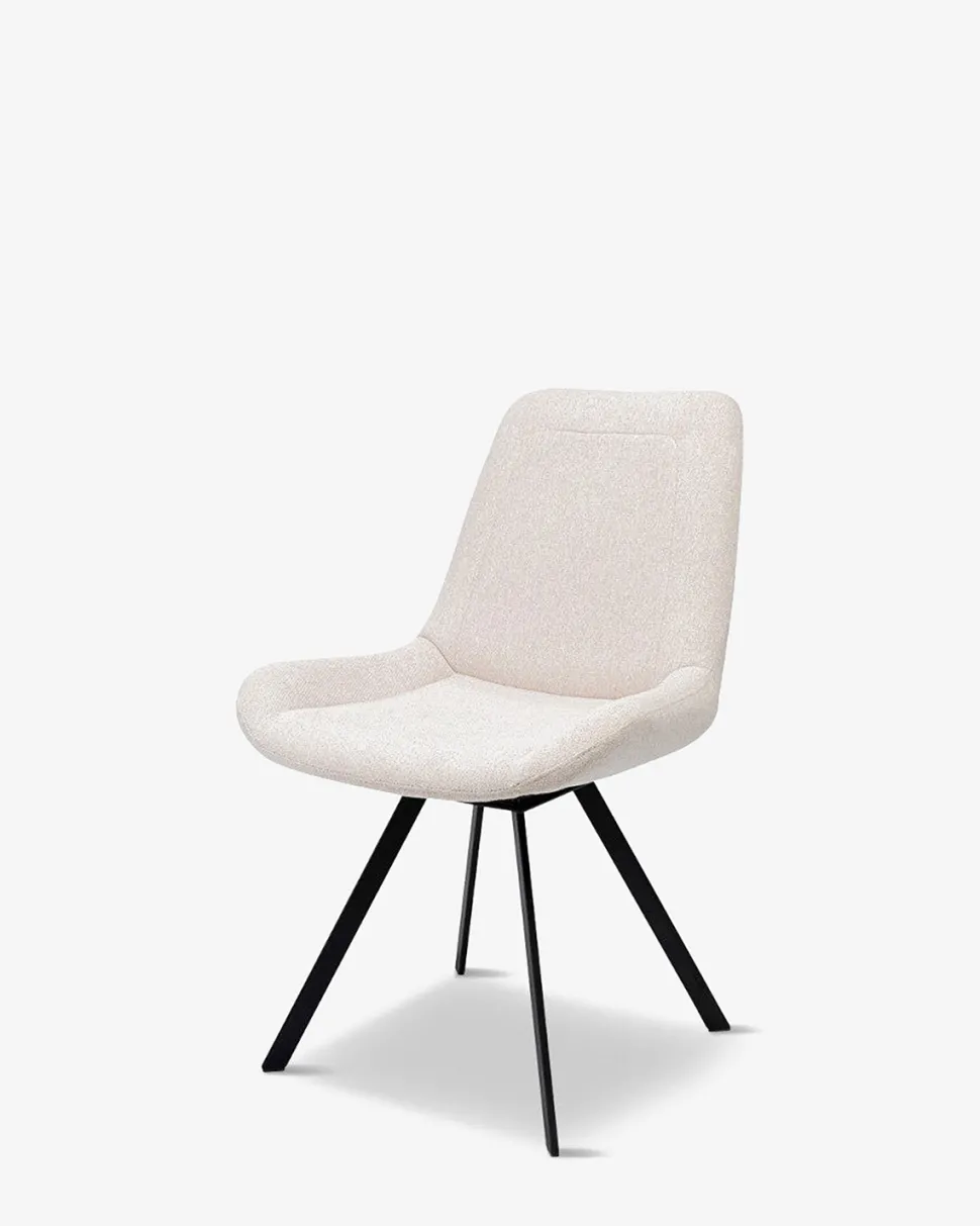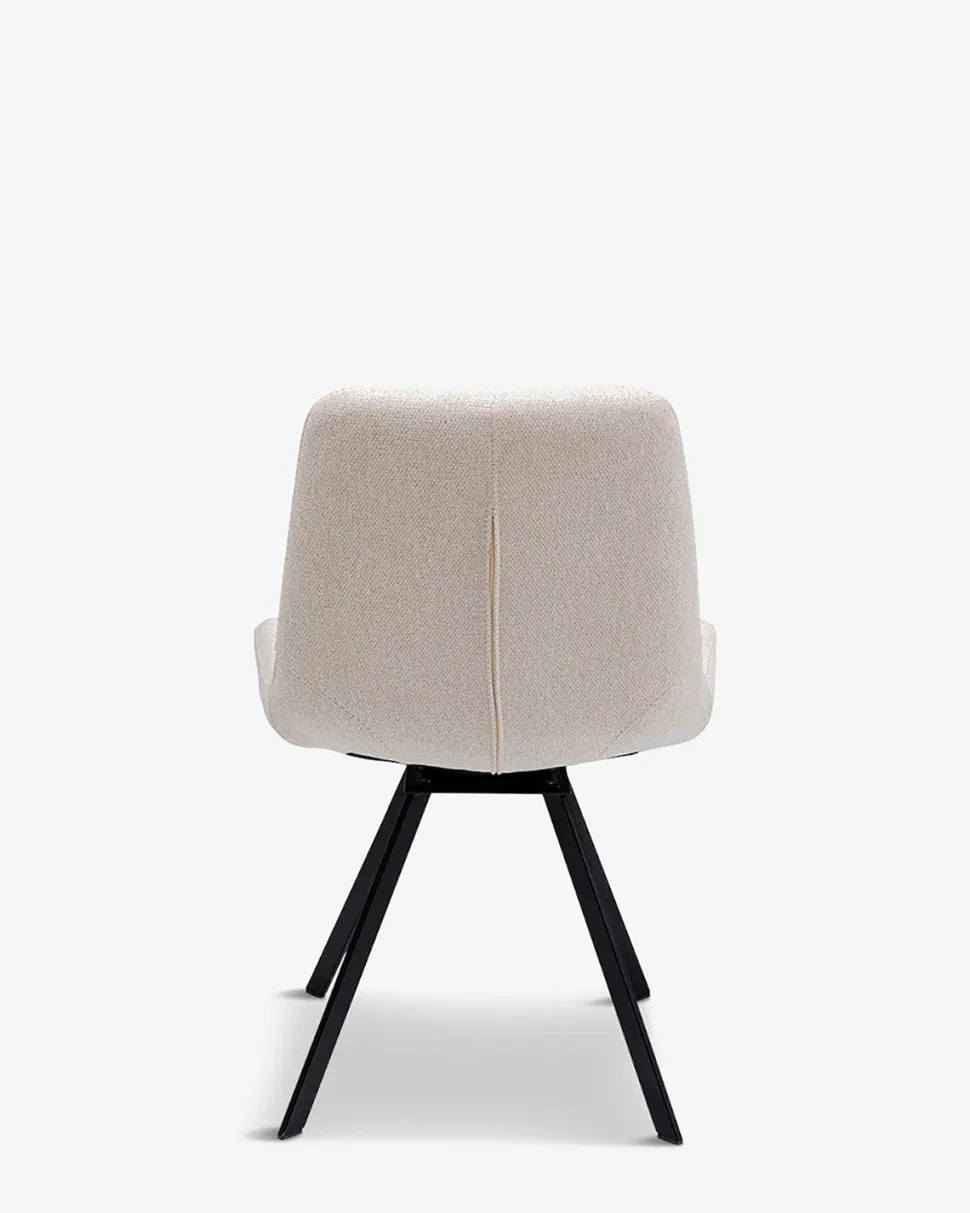 Flot og enkel spisebordsstol i sandfarvet stof med sort drejestel. Den er både komfortabel og indbydende.