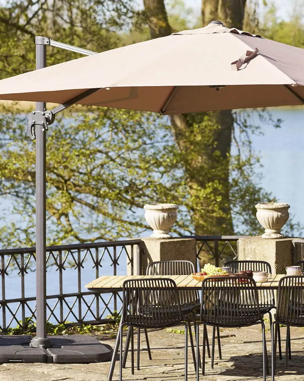 Baza hængeparasollen i sandfarve kombinerer funktionalitet og stil i et elegant design. Den store kvadratiske parasolskærm skaber et behageligt skyggeområde og gør parasollen ideel til terrassen, altanen eller haven.
