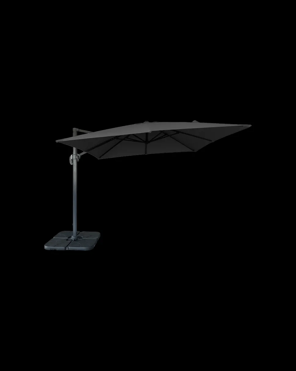 Baza hængeparasol i sort med stor skærm 295×295 cm. Parasol med grå aluminiumsstok, tilt-funktion og parasolfod inkluderet.