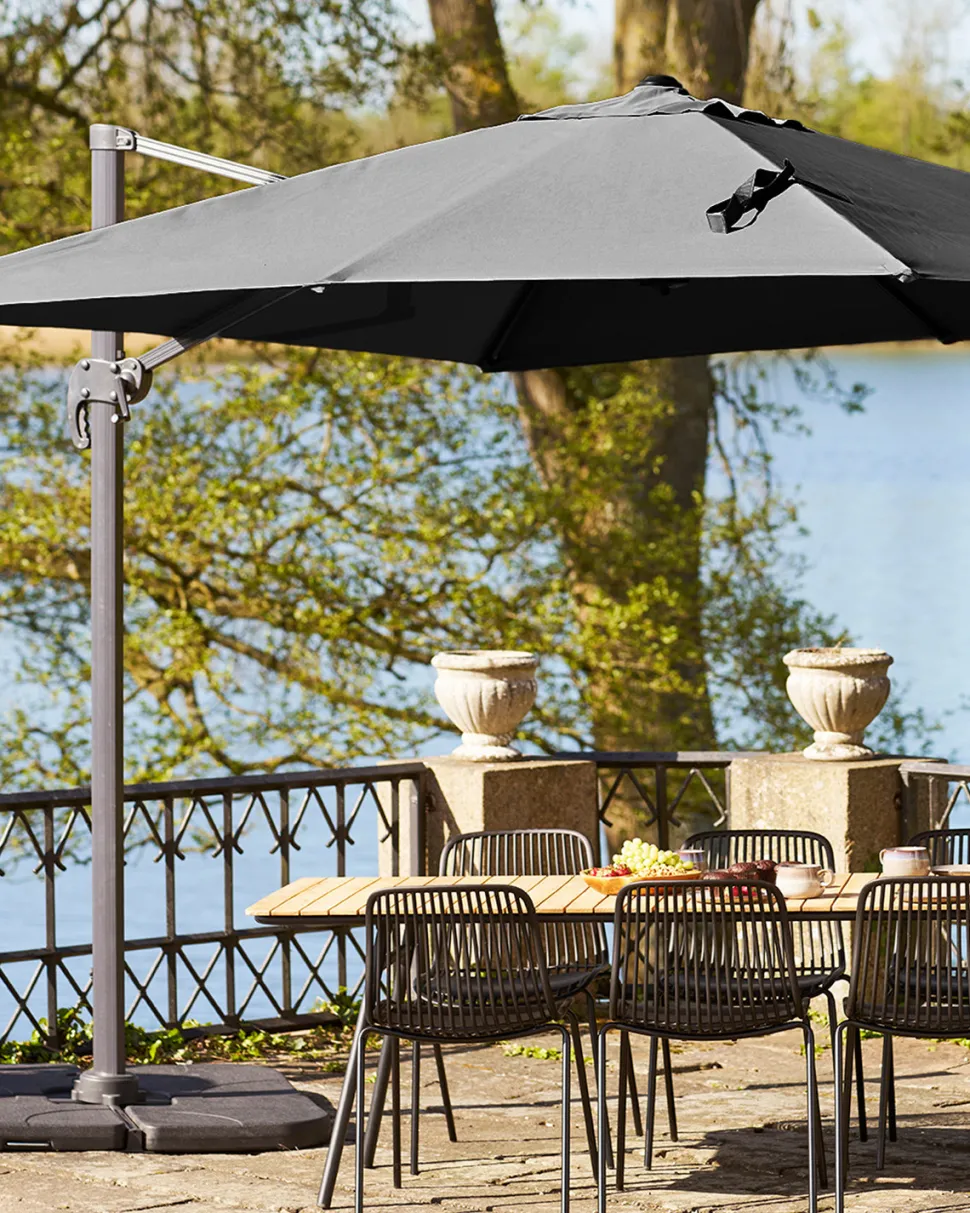 Baza hængeparasollen er en praktisk og stilfuld løsning til terrassen eller haven, hvor du ønsker god skygge uden en parasolstang midt på bordet. Den store kvadratiske skærm giver generøs skygge og skaber et behageligt uderum på solrige dage.