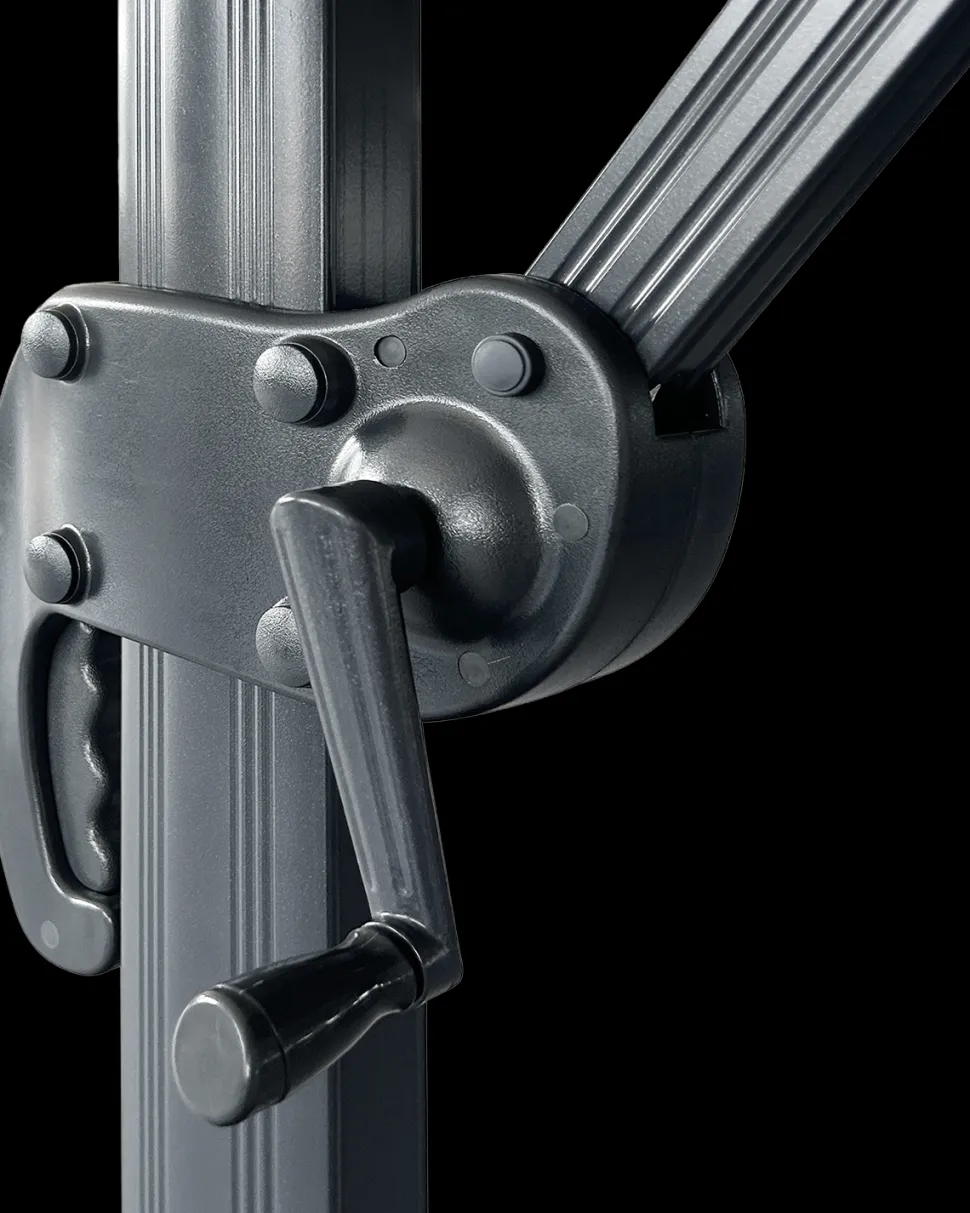 Parasollen har en stabil grå aluminiumsstok, som giver et moderne udtryk og samtidig sikrer en robust konstruktion. Med det integrerede håndtag kan parasollen nemt foldes op og ned, og skærmen kan tiltes, så du let kan justere skyggen efter solens position.