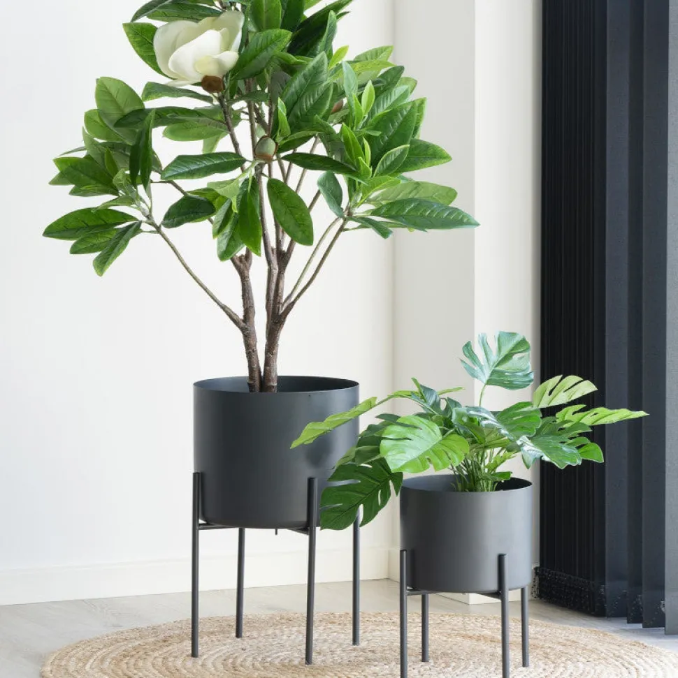 Elegant blomsterstander sæt i gråt stål er et stilfuldt og moderne valg til ethvert hjem eller have.