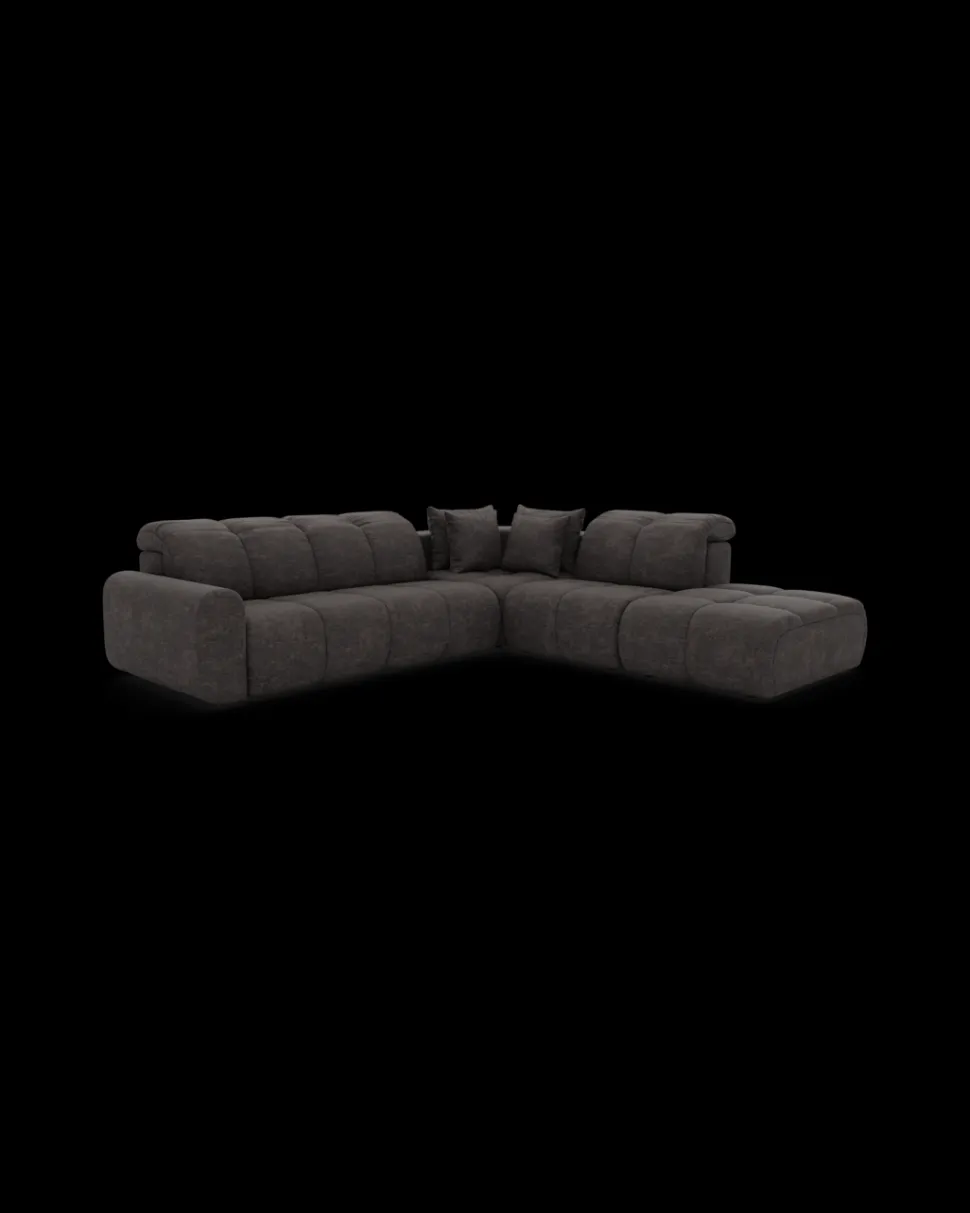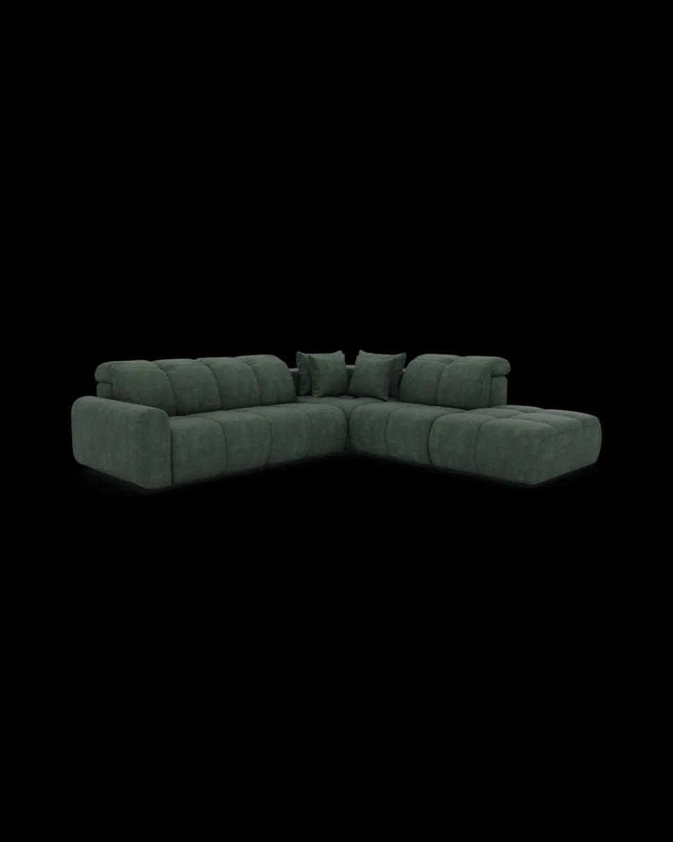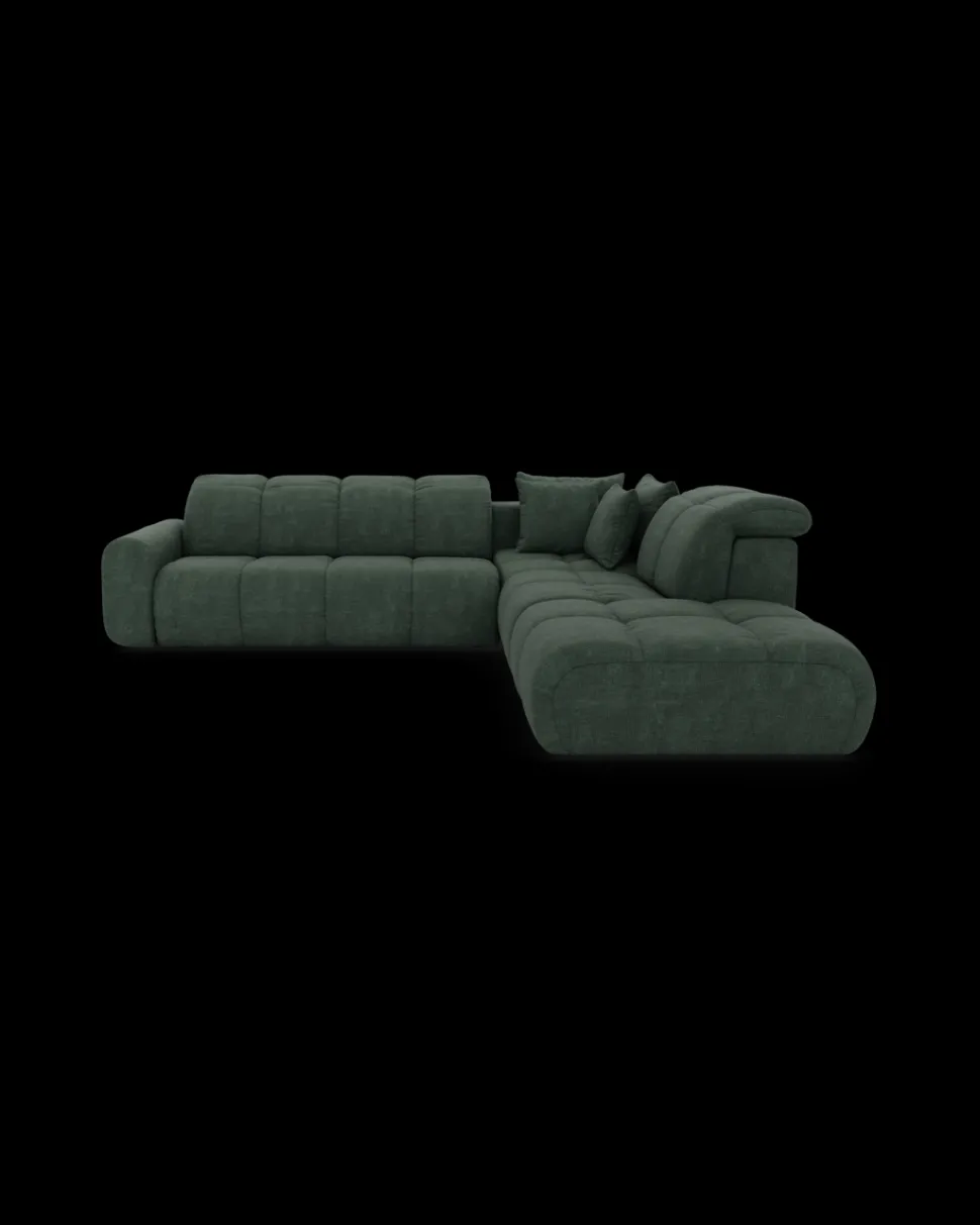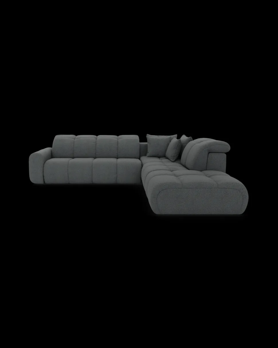 Bullet hjørnesofa med rundt hjørne og open end. Puffet design med justerbare nakkepuder og høj komfort