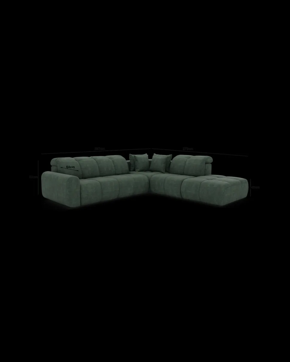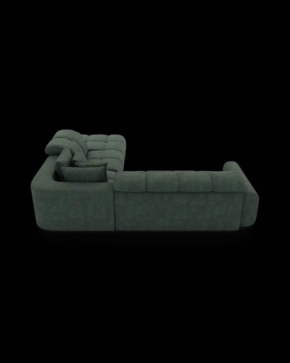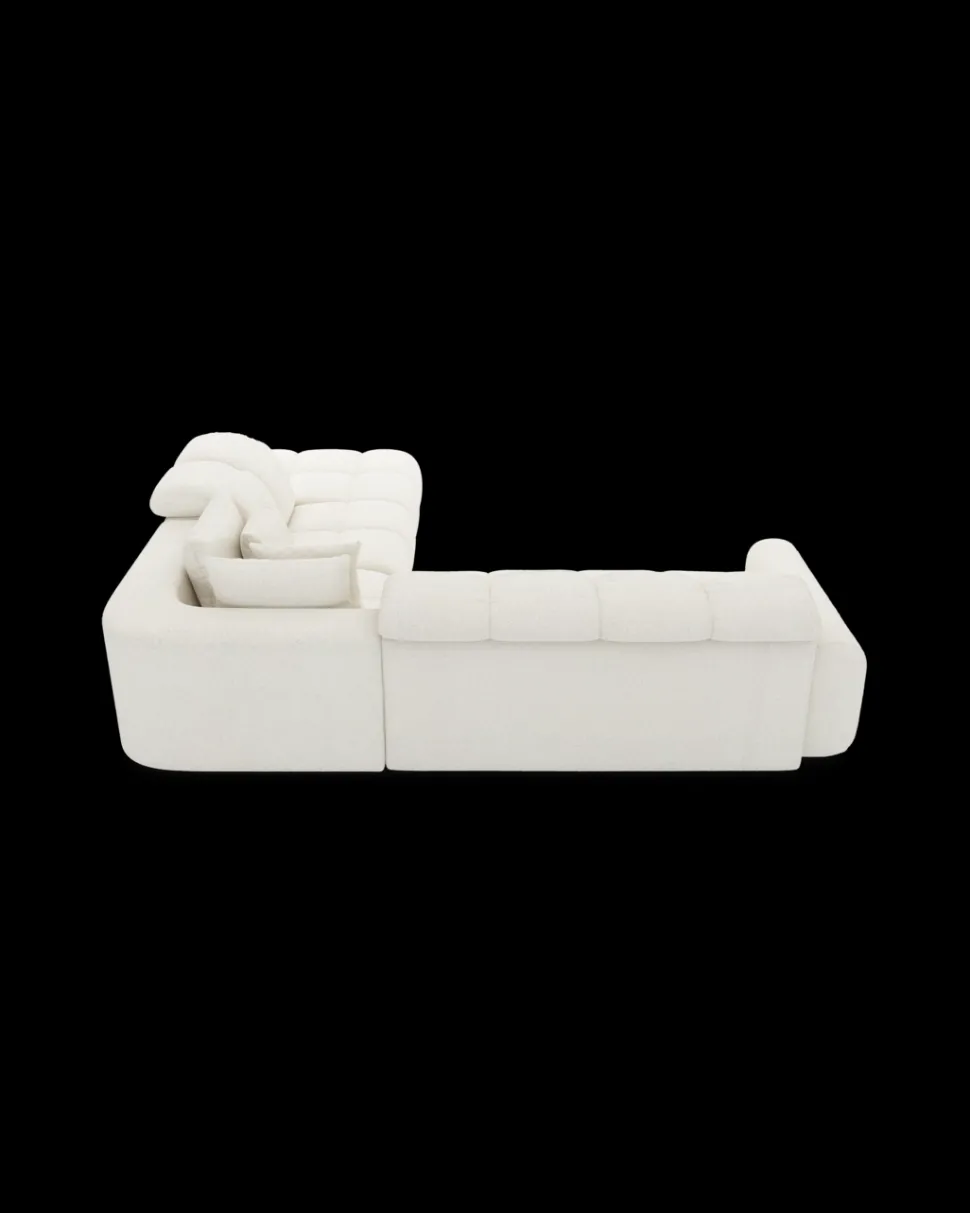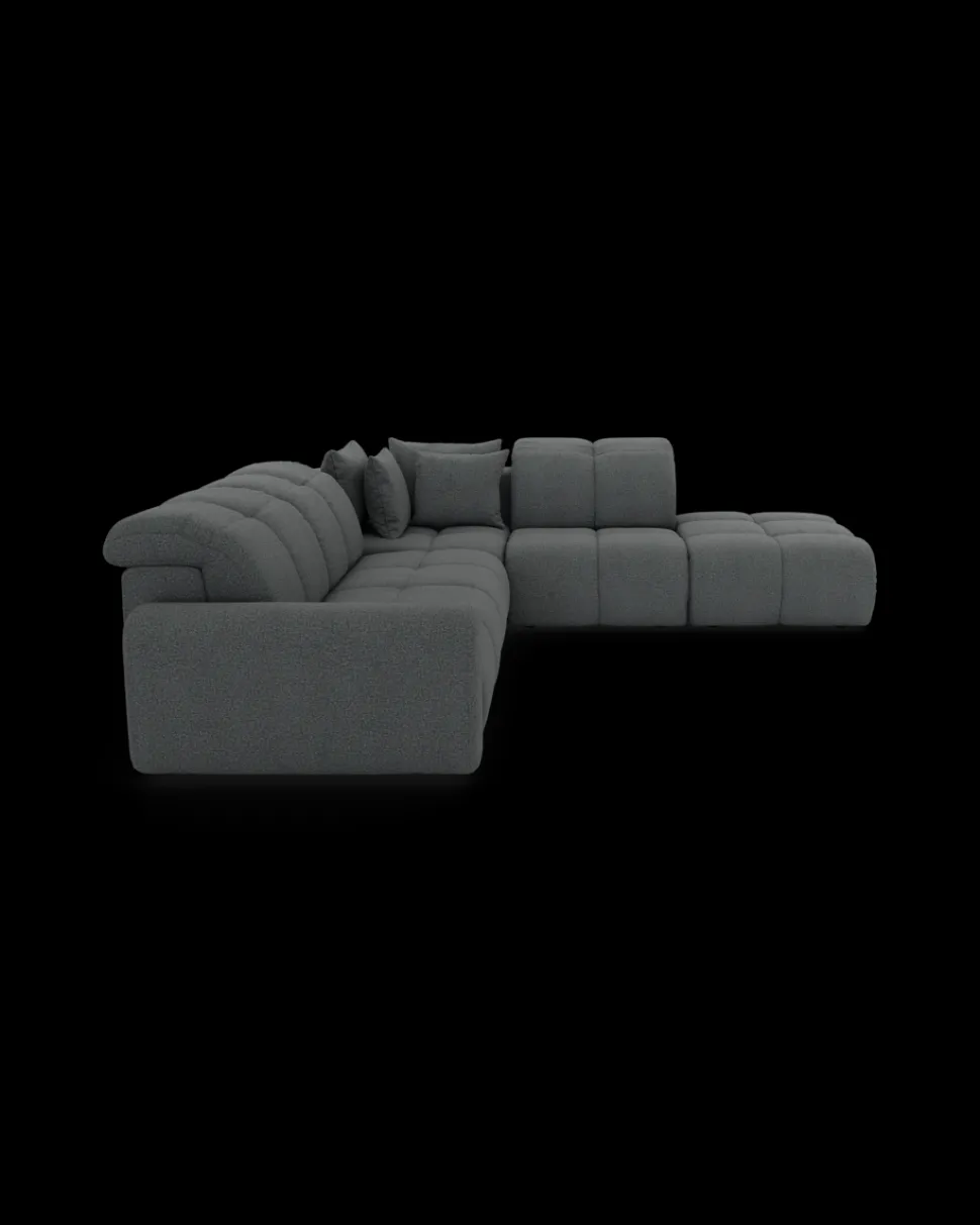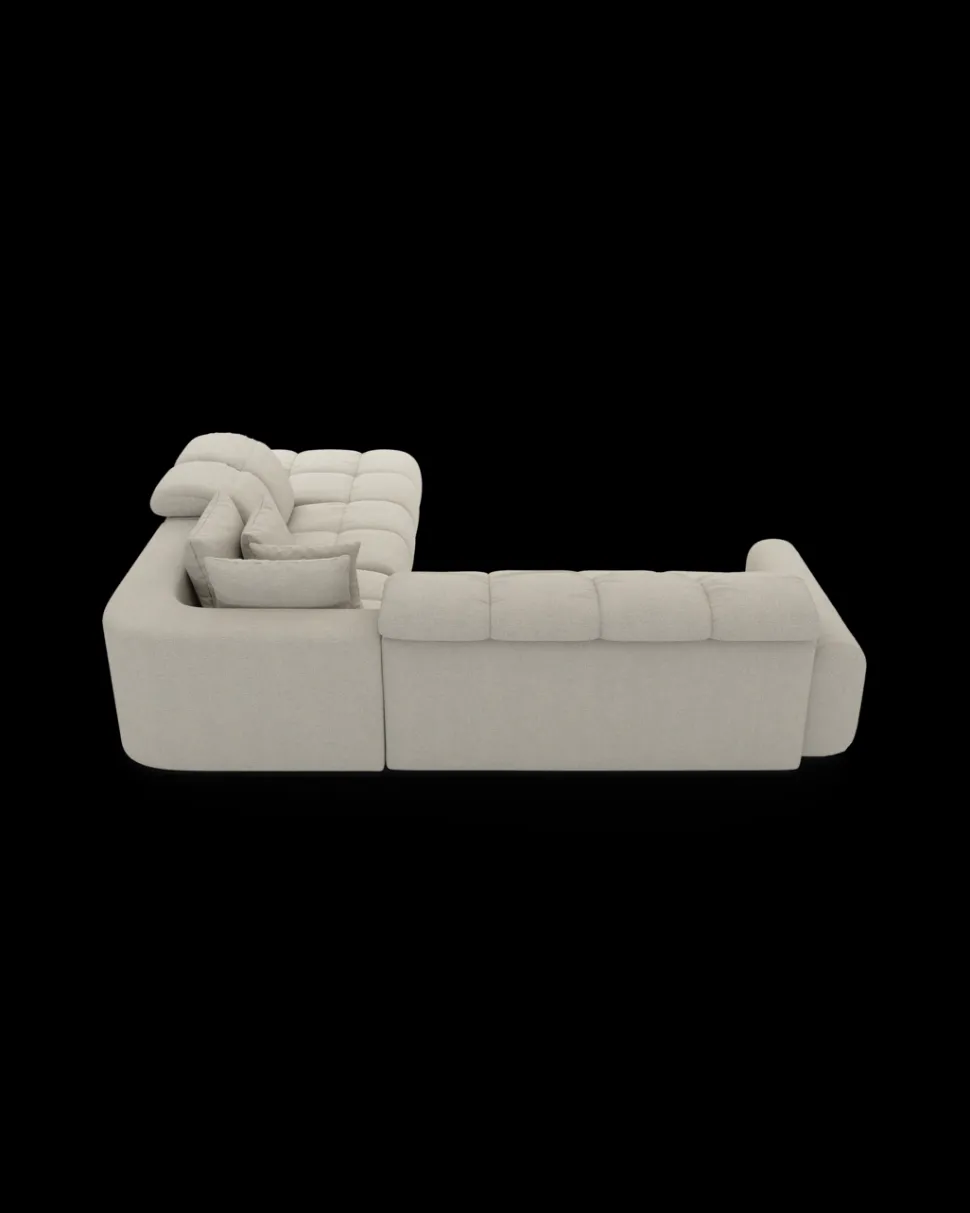 Bullet hjørnesofa med rundt hjørne og open end. Puffet design med justerbare nakkepuder og høj komfort