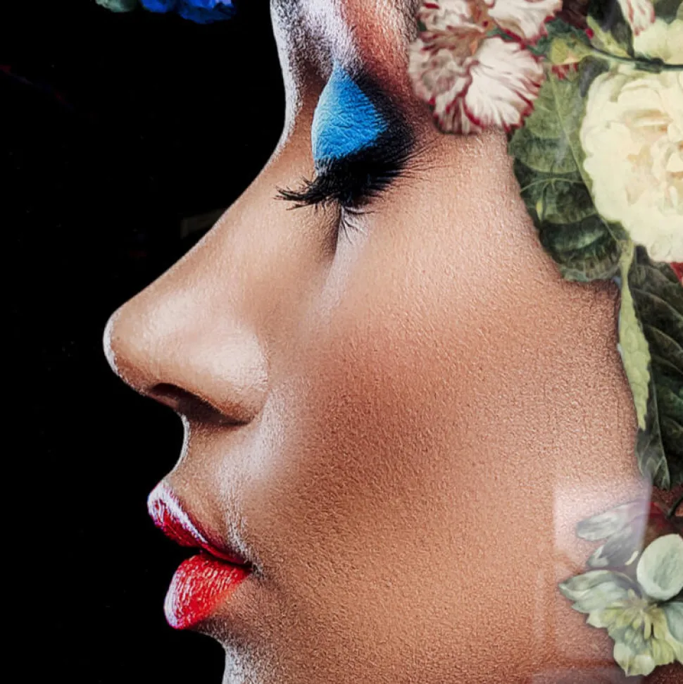 Billedet er trykt på glas og uden ramme, hvilket gør billedet rent og moderne at kigge på.