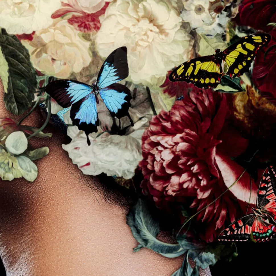Fantastisk billede med en kvinde med et stort og farverigt blomsterhav og en masse sommerfugle, som gør dette billede meget unikt.