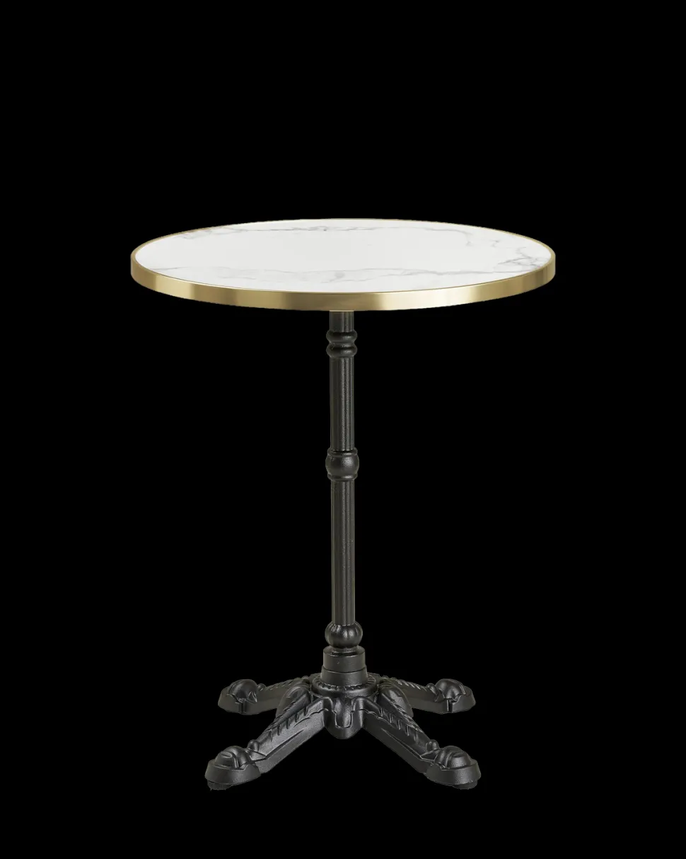 Det sorte stel i støbejern giver bordet et solidt fundament og tilfører et klassisk cafépræg. Kombinationen af den lyse bordplade og det mørke stel skaber en flot kontrast, som gør bordet til et stilrent blikfang.