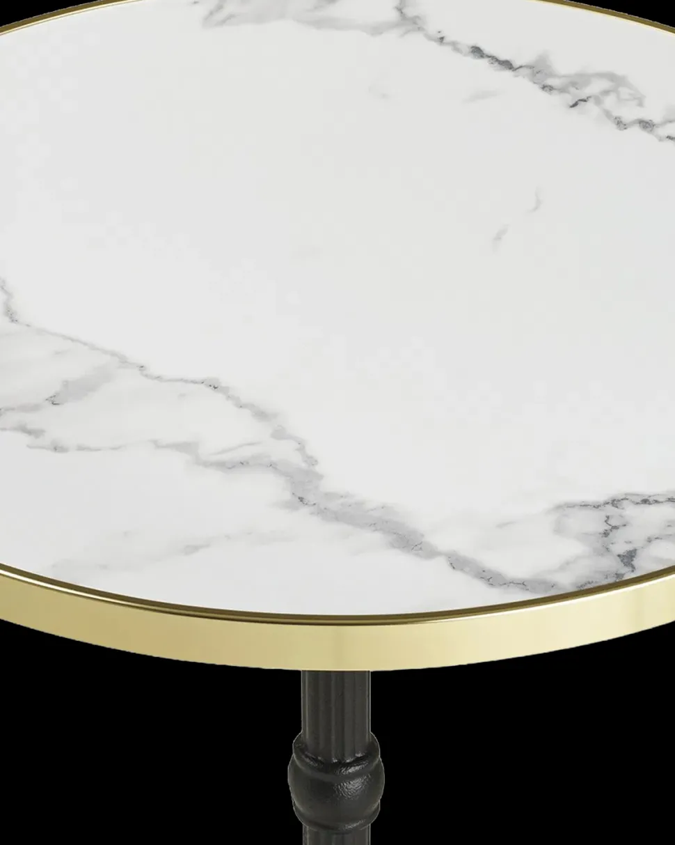 Cafébord Ø.60 cm med hvid marmor look bordplade og guldkant. Solidt cafébord med støbejernsstel.