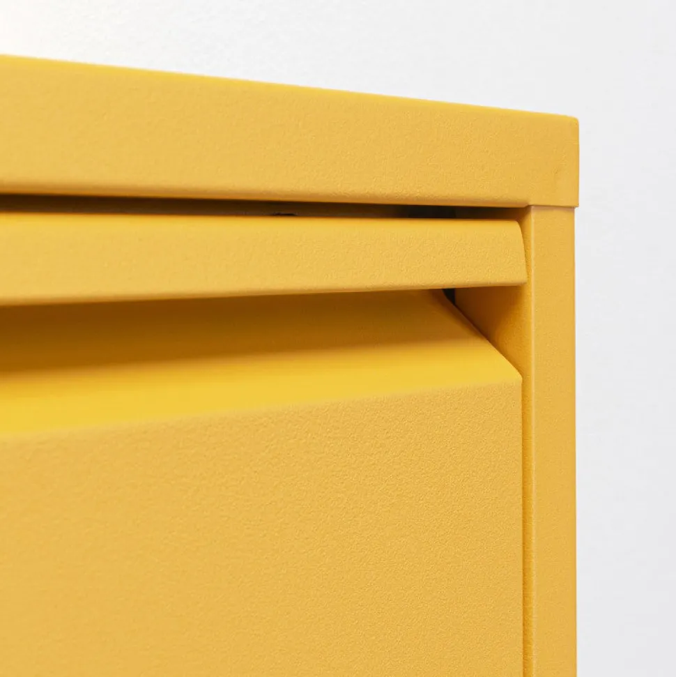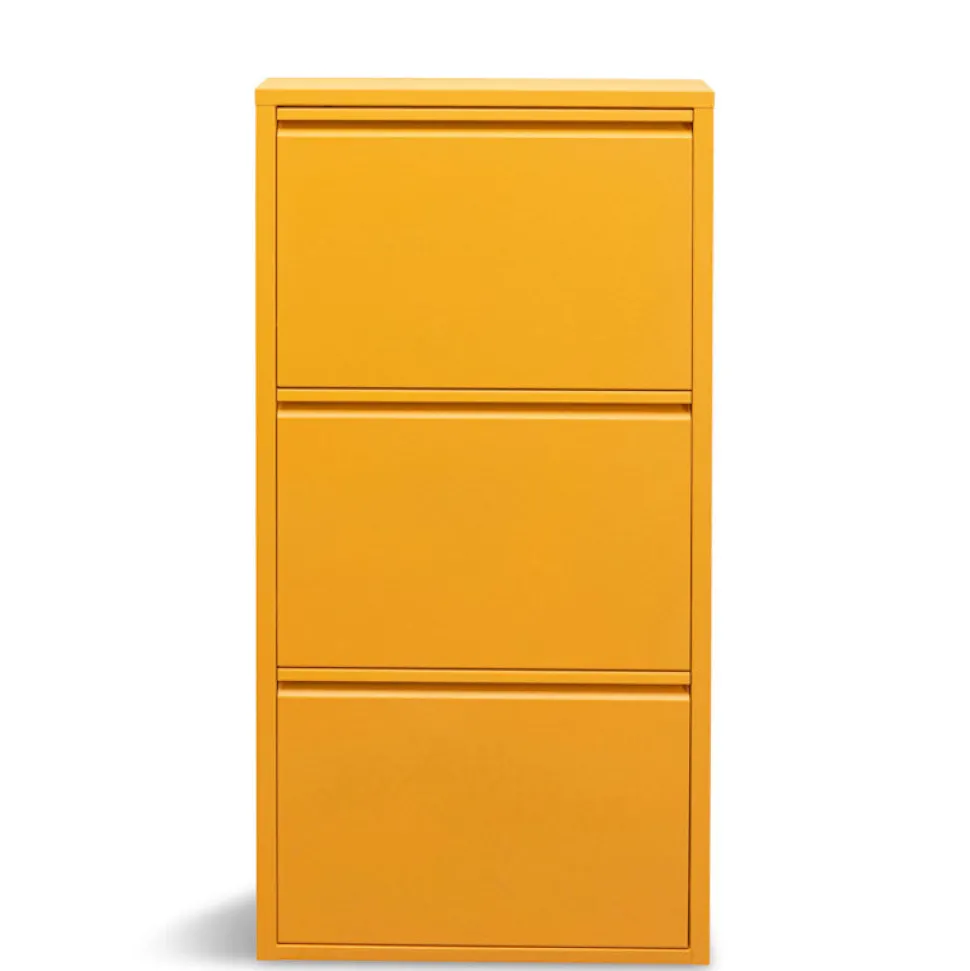 Caruso skoskabet i pulverlakeret stålplade og attraktiv gul er et meget stilrent og elegant skoskab.