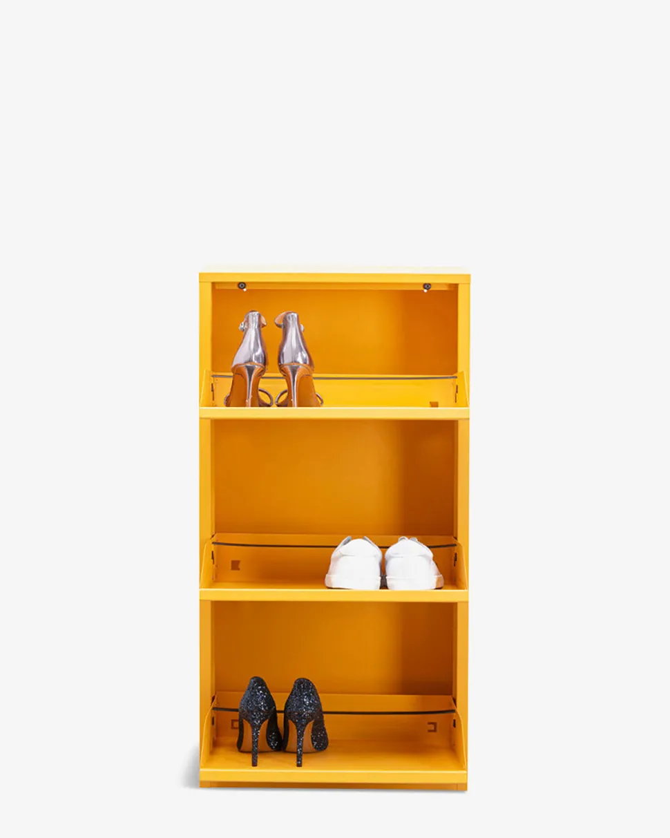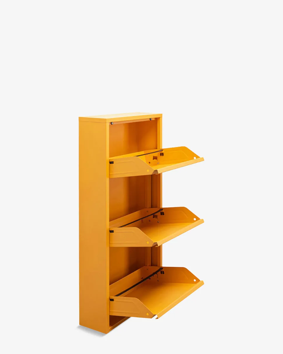 Caruso Skoskab i attraktiv gul, udført i pulverlakeret stålplade. Et meget stilrent og elegant møbel, der organiserer dine sko.