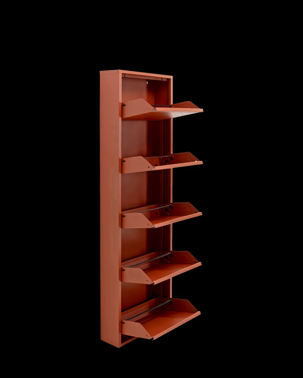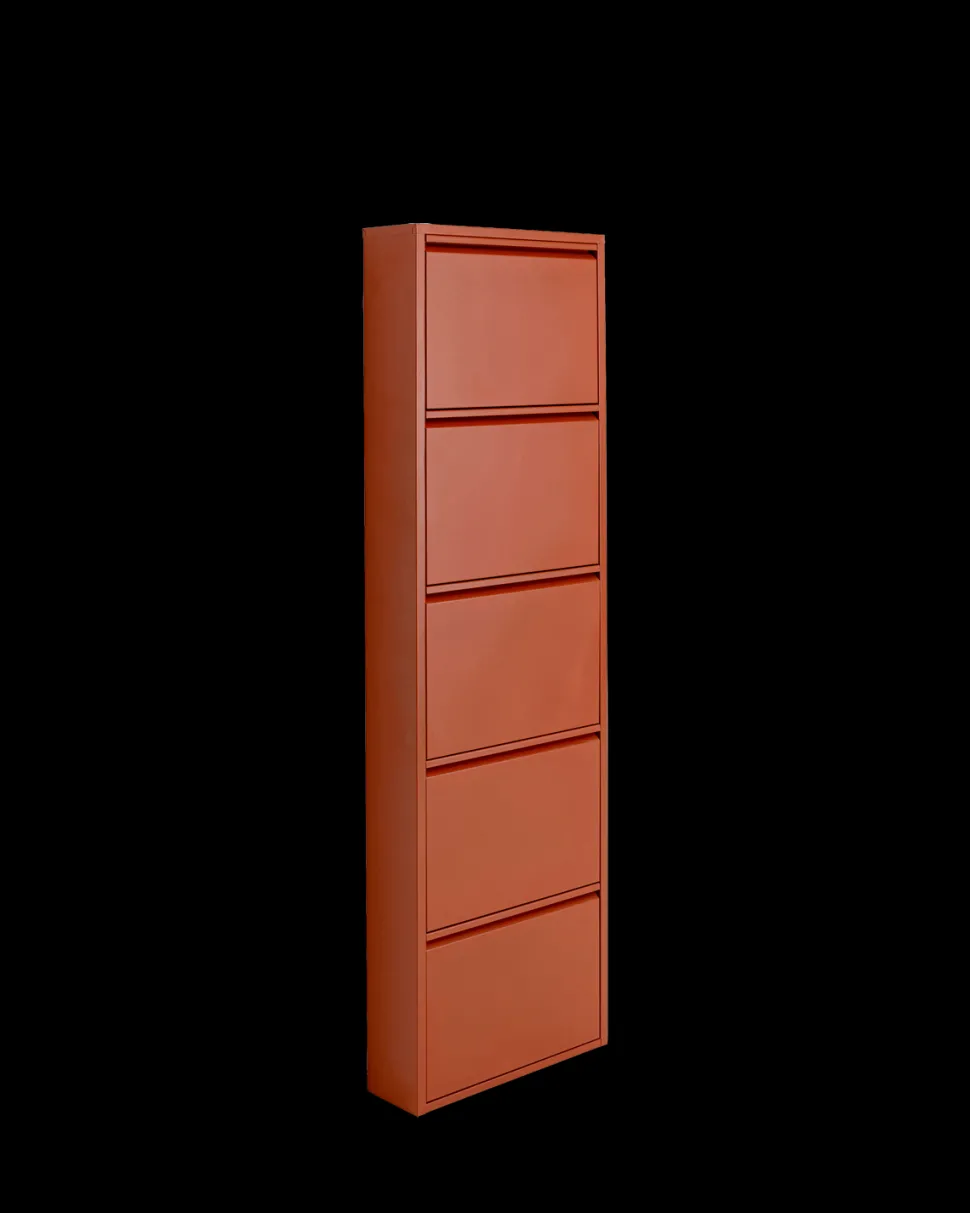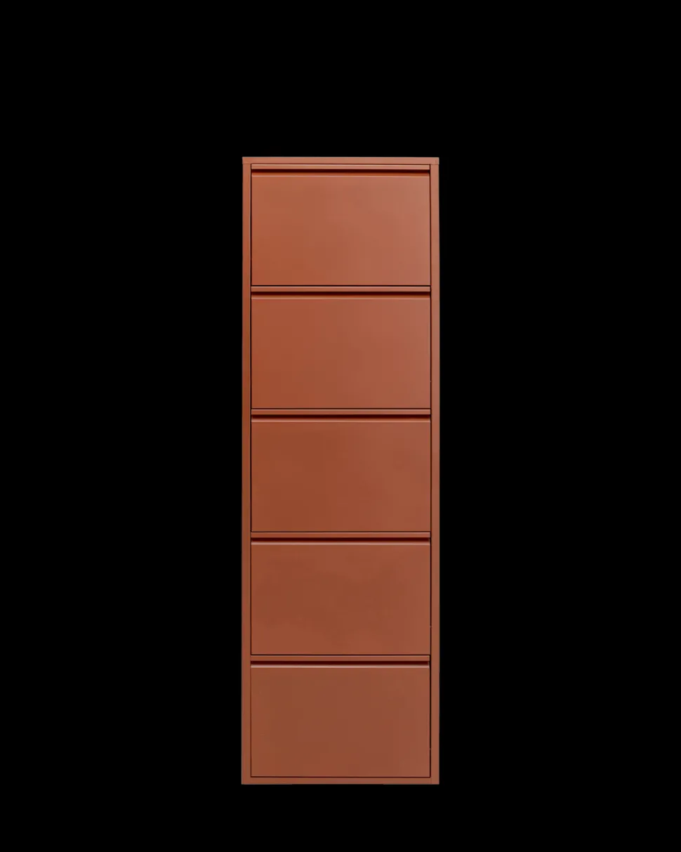 Caruso Skoskab i pulverlakeret stålplade og attraktiv lakeret brun farve. Bag de fem låger er der plads til opbevaring.