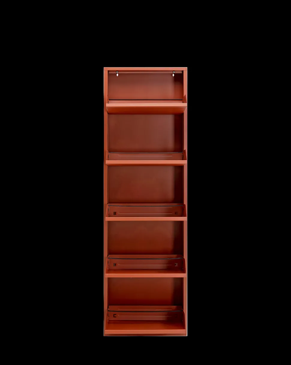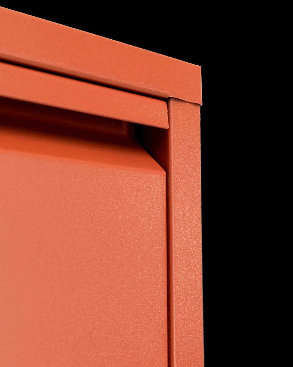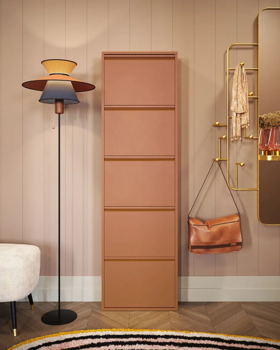 Caruso Skoskab i pulverlakeret stålplade og attraktiv lakeret brun farve. Bag de fem låger er der plads til opbevaring.