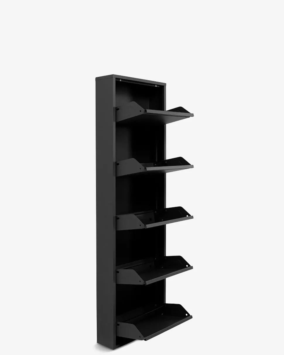 Et skoskab med stil. Caruso skoskabet i pulverlakeret stålplade og sort lakering er et meget stilrent og elegant møbel.