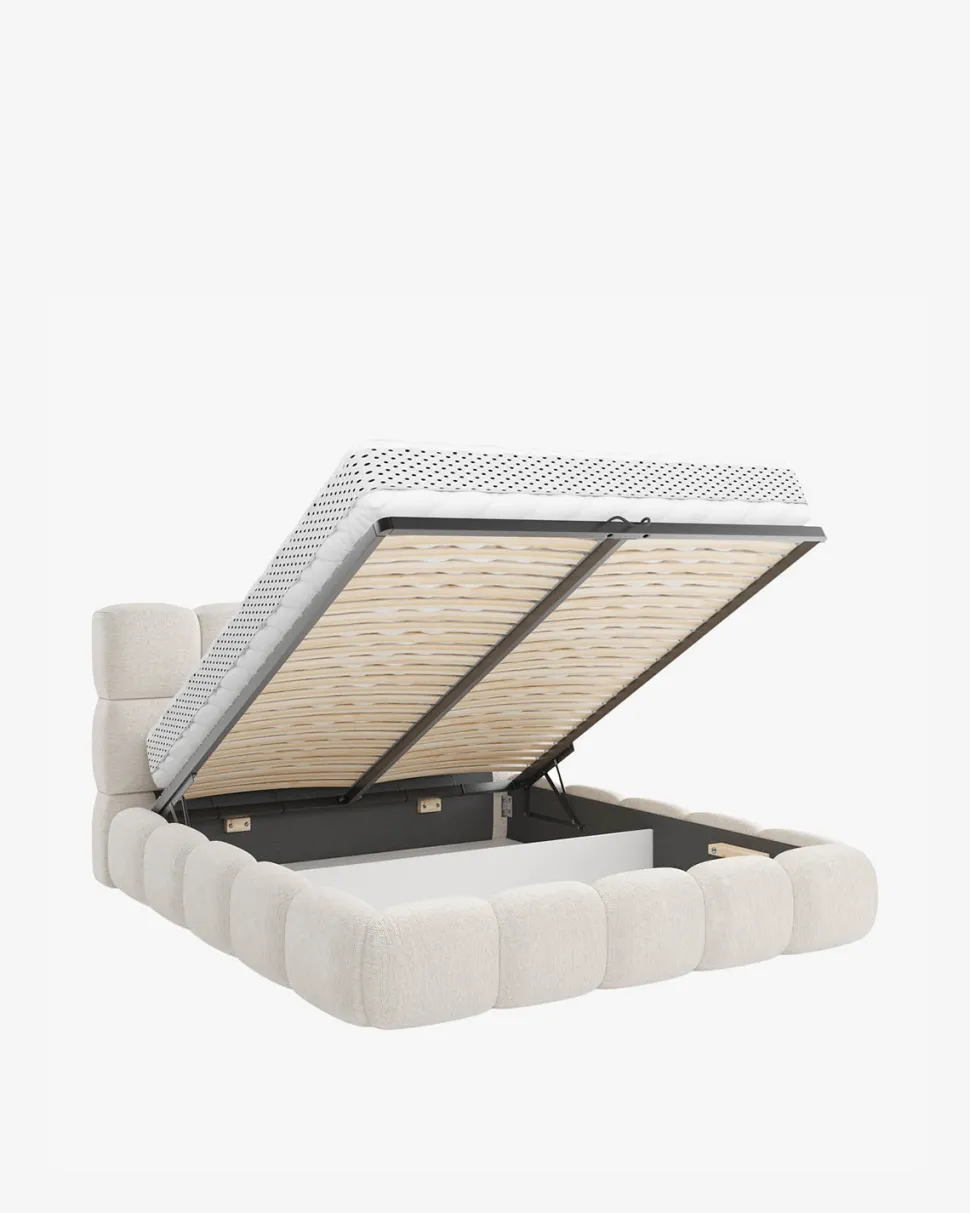 Cherry magasinsengen er en stilfuld og praktisk løsning til dig, der ønsker komfort, funktion og et indbydende design samlet i ét møbel. Sengen er betrukket med et blødt beige stof, og det afrundede formsprog kombineret med madrassens lækre komfort giver følelsen af at sove på en sky.