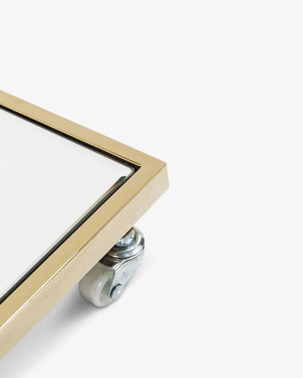 Dette flotte og enkle rullebord er udført i rustfrit stål der er lakeret så det minder om guld og med en glasspejl plade som bordplade.