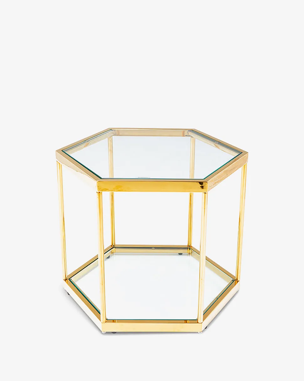 Det flotte sofabord i guld og stål er sekskantet og med glasbordplade.