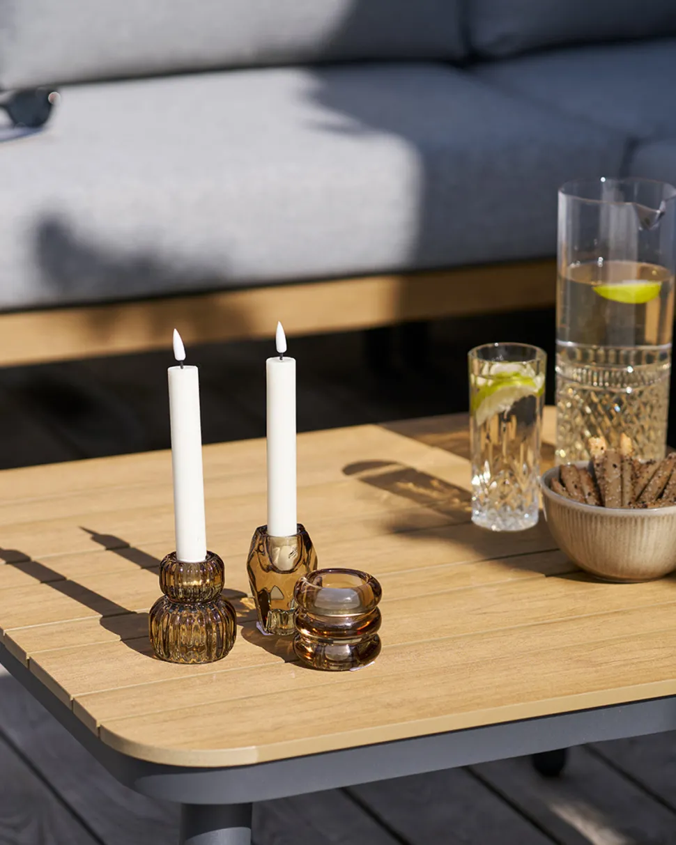 Det medfølgende sofabord har en bordplade i non-wood med eg-look, som tilfører varme og et naturligt element til designet. Sammen skaber materialerne et harmonisk loungesæt, der både er praktisk, holdbart og elegant.