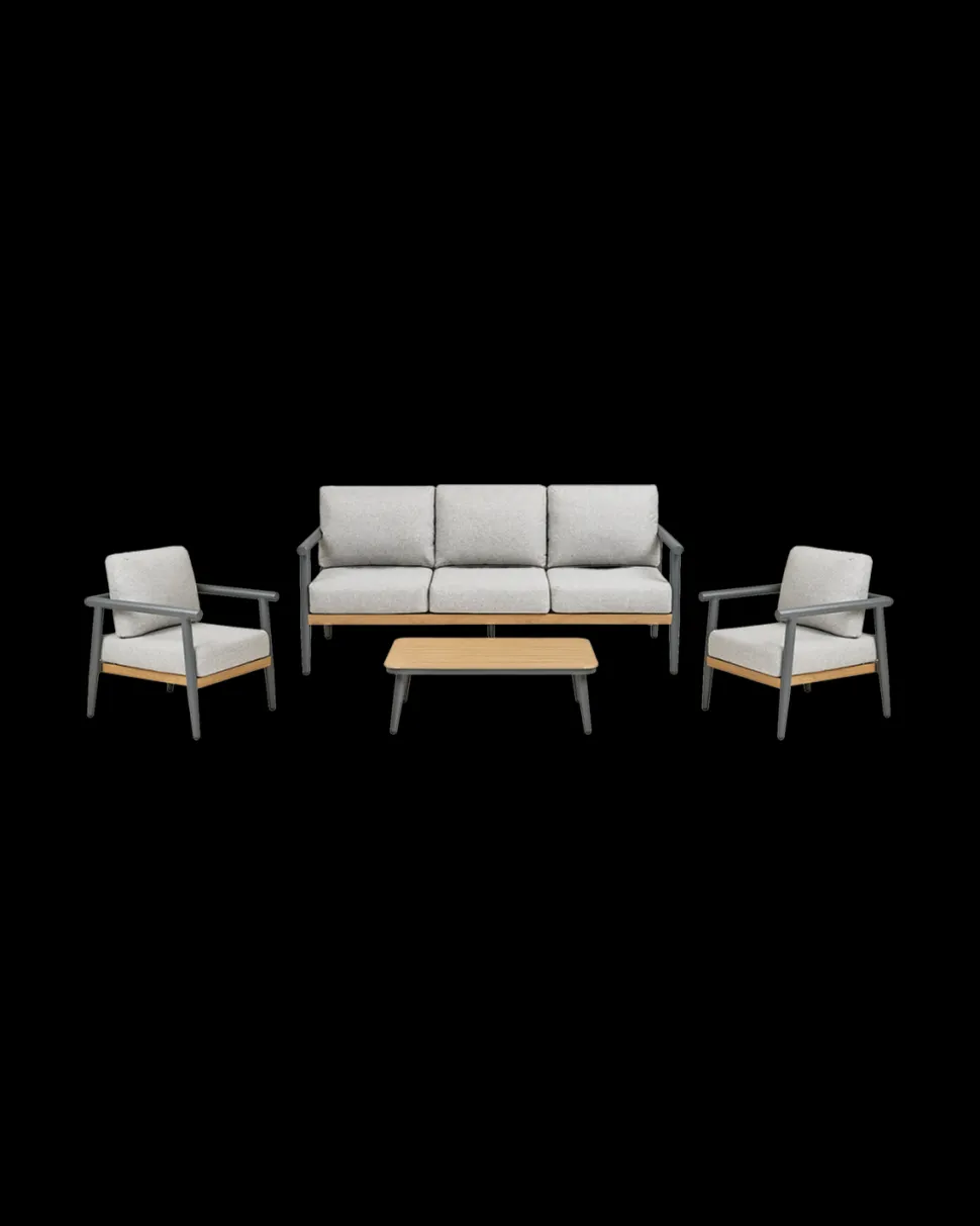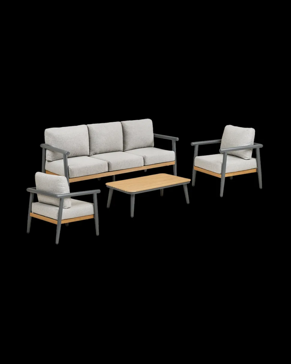 Sættet består af en rummelig sofa, to loungestole og et rektangulært sofabord. De kraftige sæde- og ryghynder er betrukket med hurtigtørrende tekstil, som gør sættet velegnet til udendørs brug og sikrer god siddekomfort.