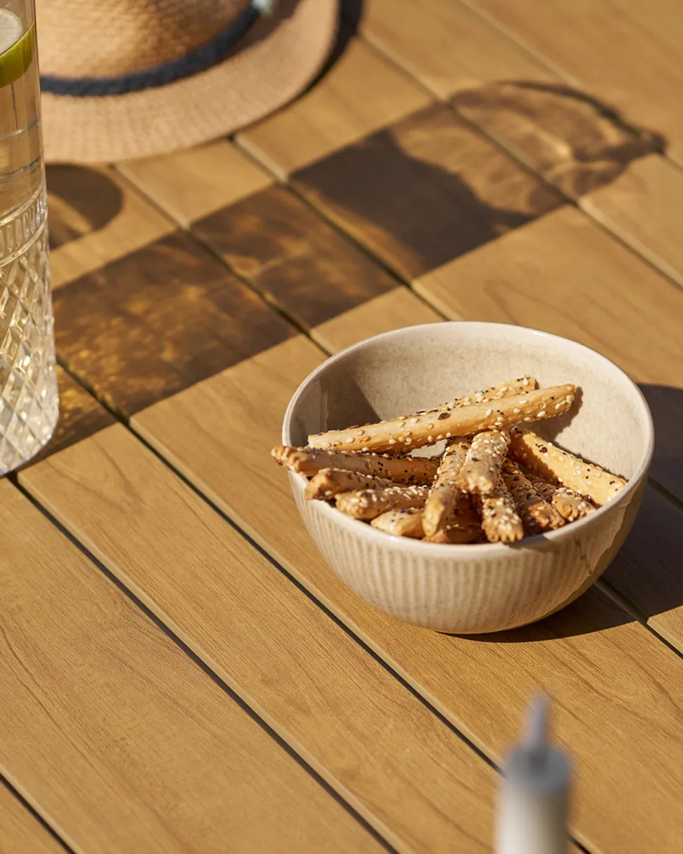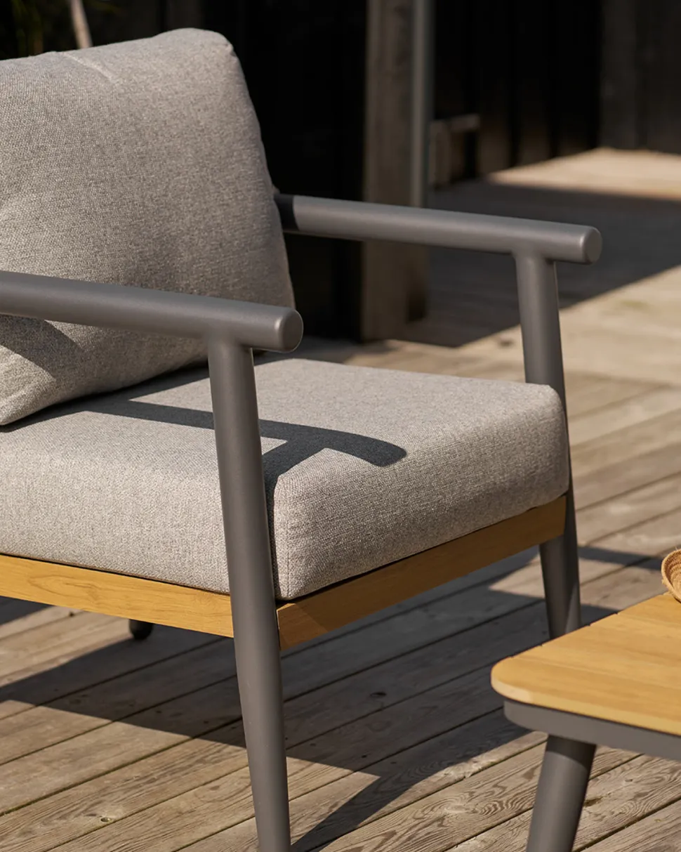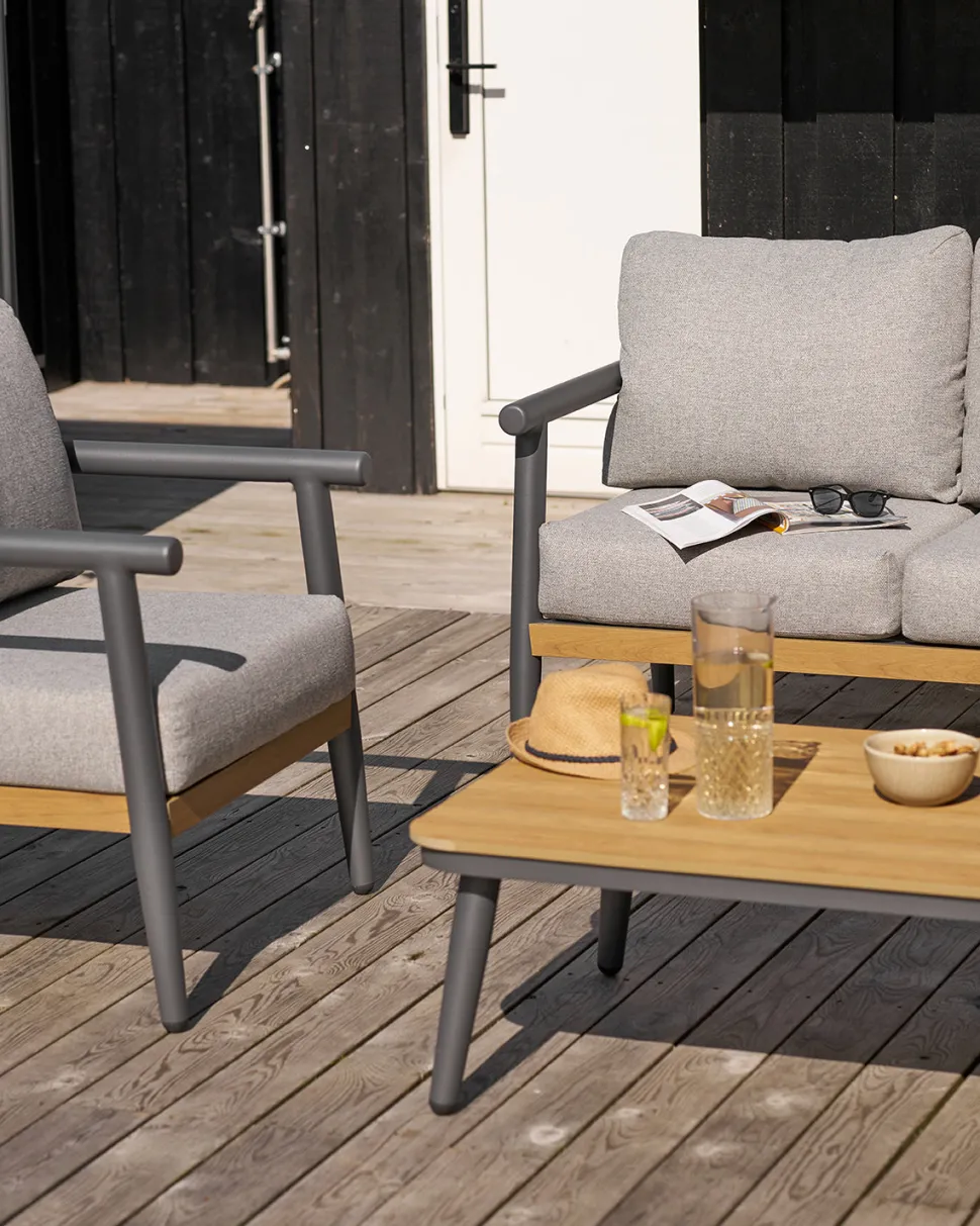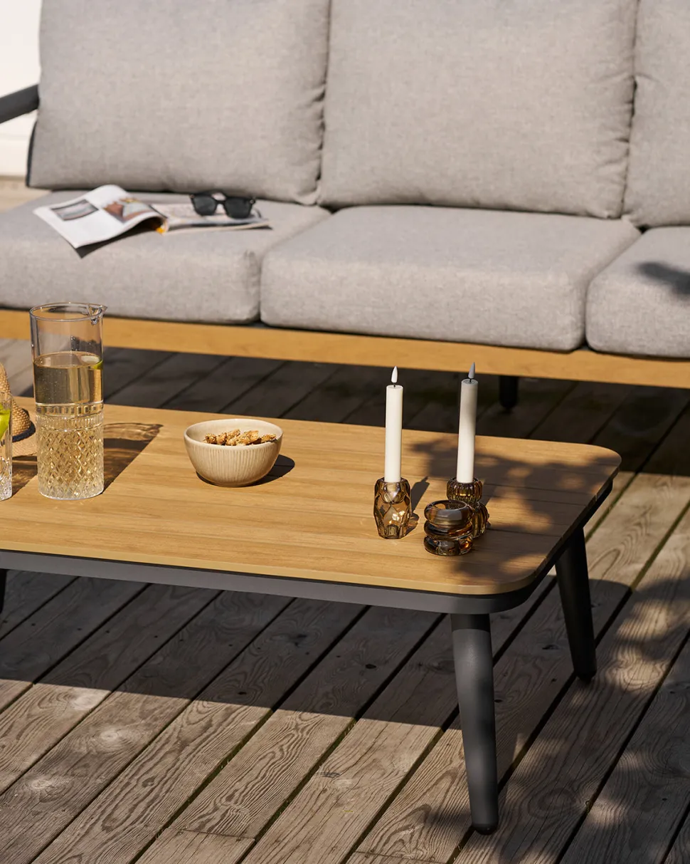 Sofabordet har en bordplade i non-wood med eg-look, som tilfører varme og et naturligt udtryk til designet. Kombinationen af de robuste materialer og det moderne formsprog gør Comillas loungesættet til en stilfuld base for hyggelige stunder udendørs.