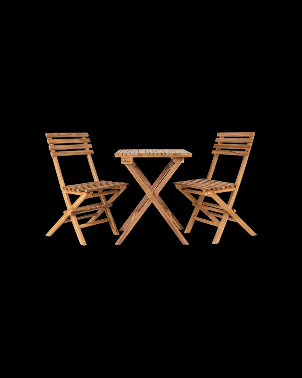 Cuenca cafésæt i natur teak med 2 stole og bord. Bord og stole kan klappes sammen for nem transport og opbevaring.