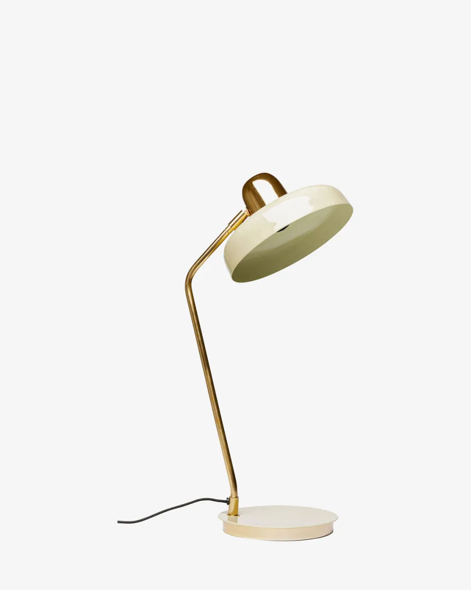 Demi bordlampen i lys grøn kombinerer tidløst design med et frisk, blødt farveudtryk. Den matte metalskærm og fod i afdæmpet grøn giver lampen et roligt og moderne look, mens den slanke messingstang tilfører varme og elegance.
