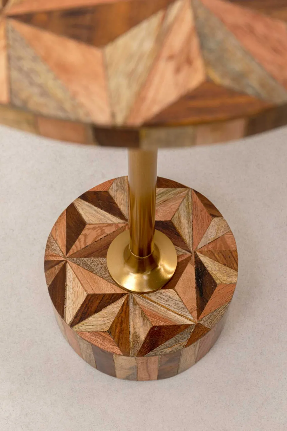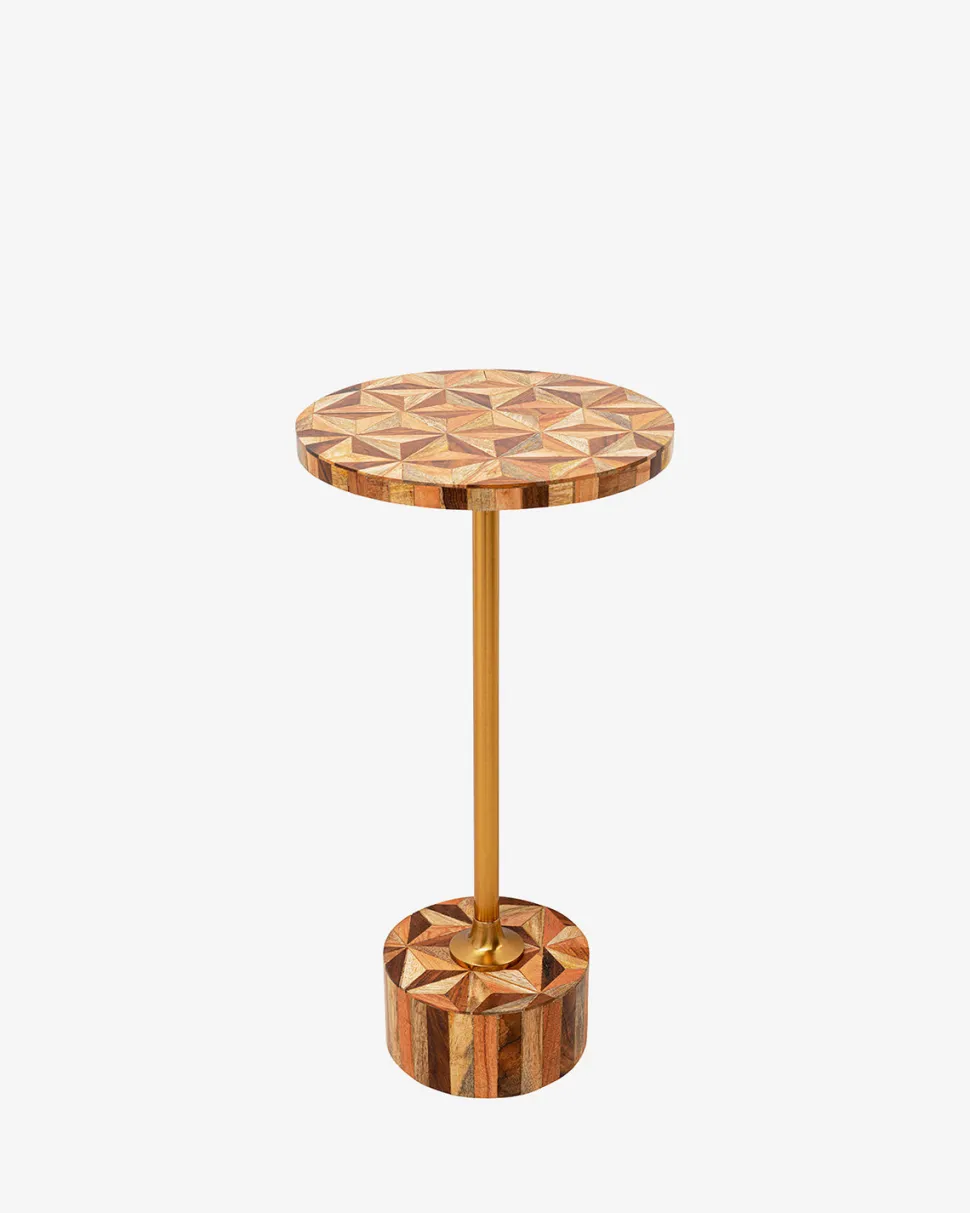 Domero Geo sidebordet kombinerer naturlige materialer med et dekorativt design. Bordpladen er udført i mørkt og lyst mangotræ med et smukt stjernemønster i mønstret indlæg, der fremhæver træets varme nuancer. Den slanke messingstang giver bordet et elegant løft og tilføjer et strejf af luksus.