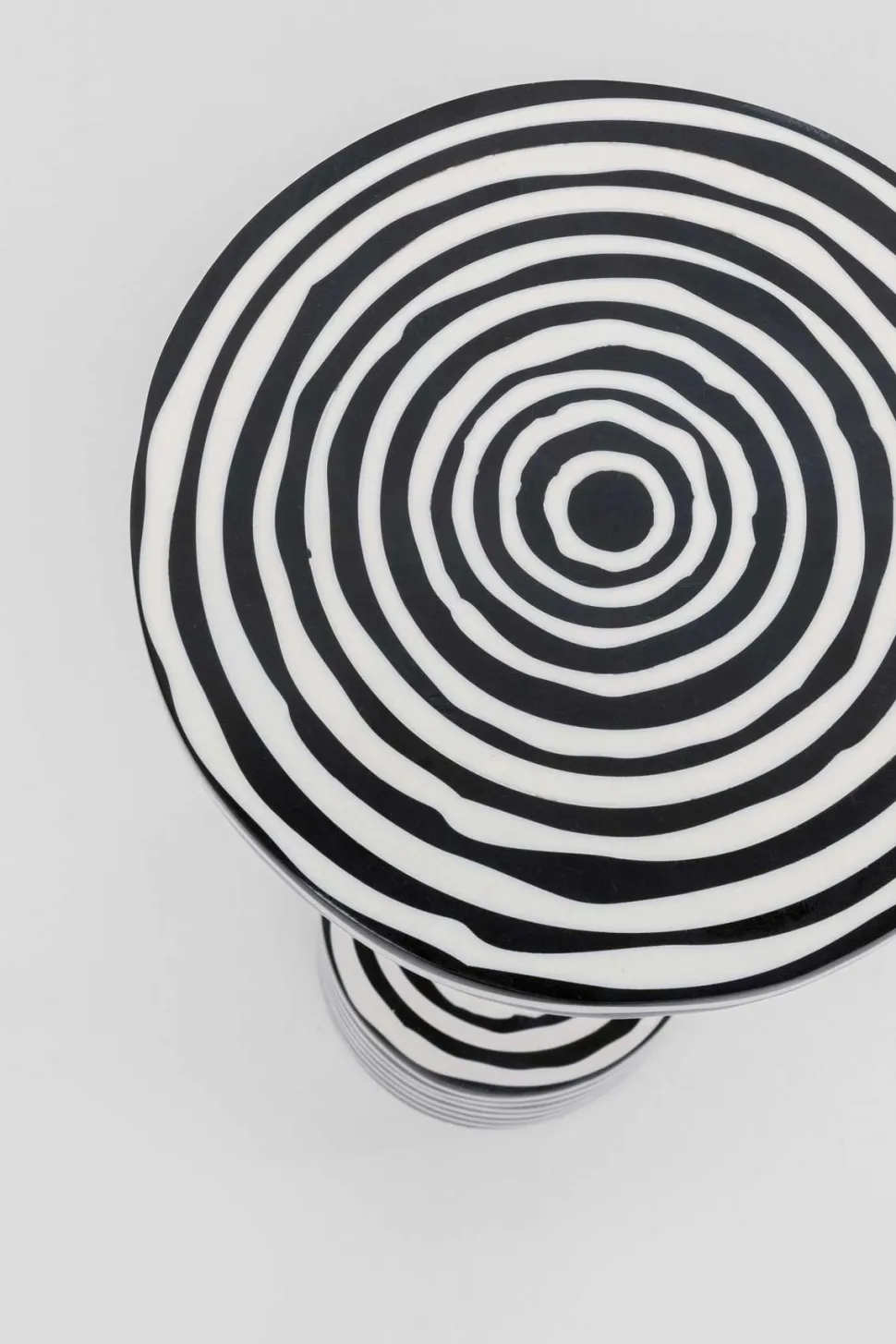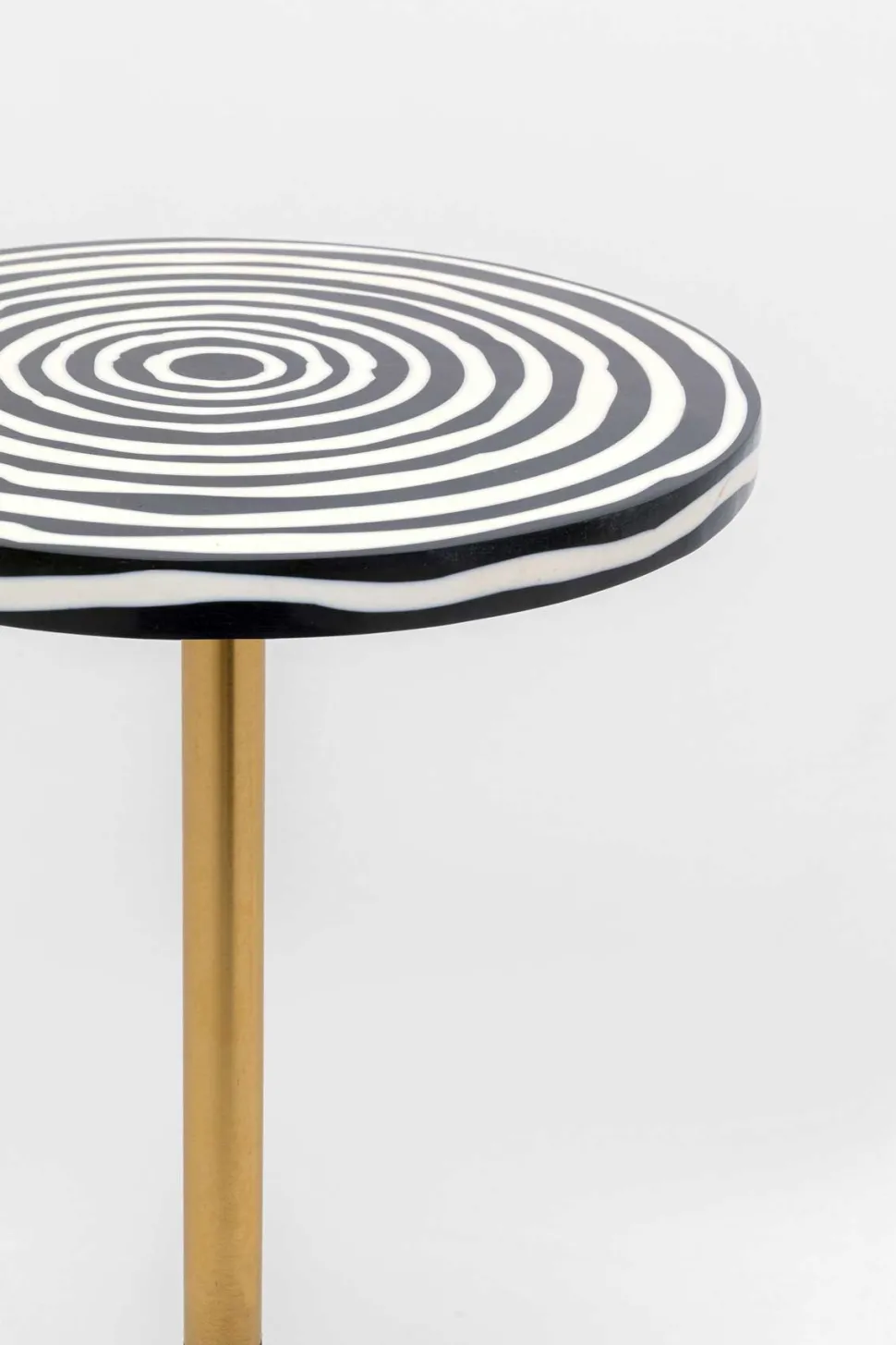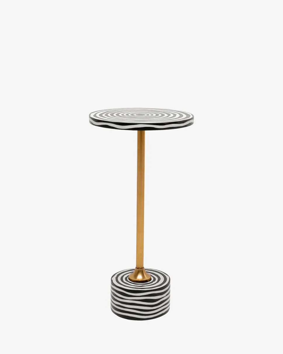 Domero Swirl sidebordet er et iøjnefaldende møbel, der kombinerer sort og hvidt mangotræ i et markant cirkelmønster. Den grafiske bordplade skaber et moderne og kunstnerisk udtryk, mens den slanke messingstang tilfører et elegant touch.
