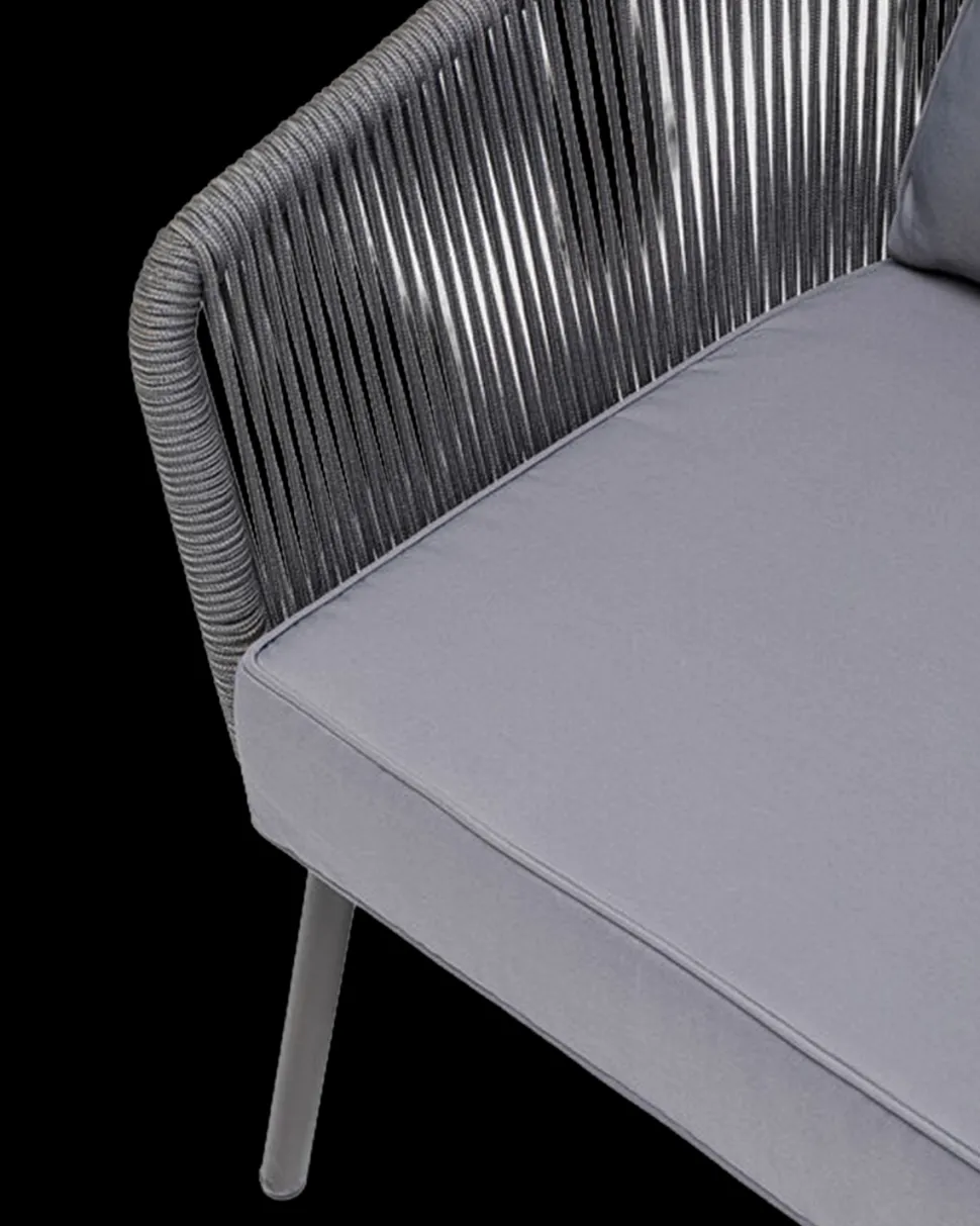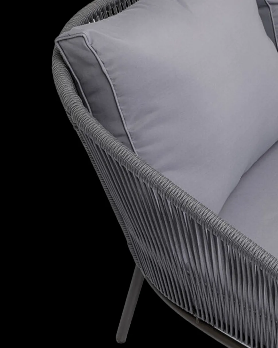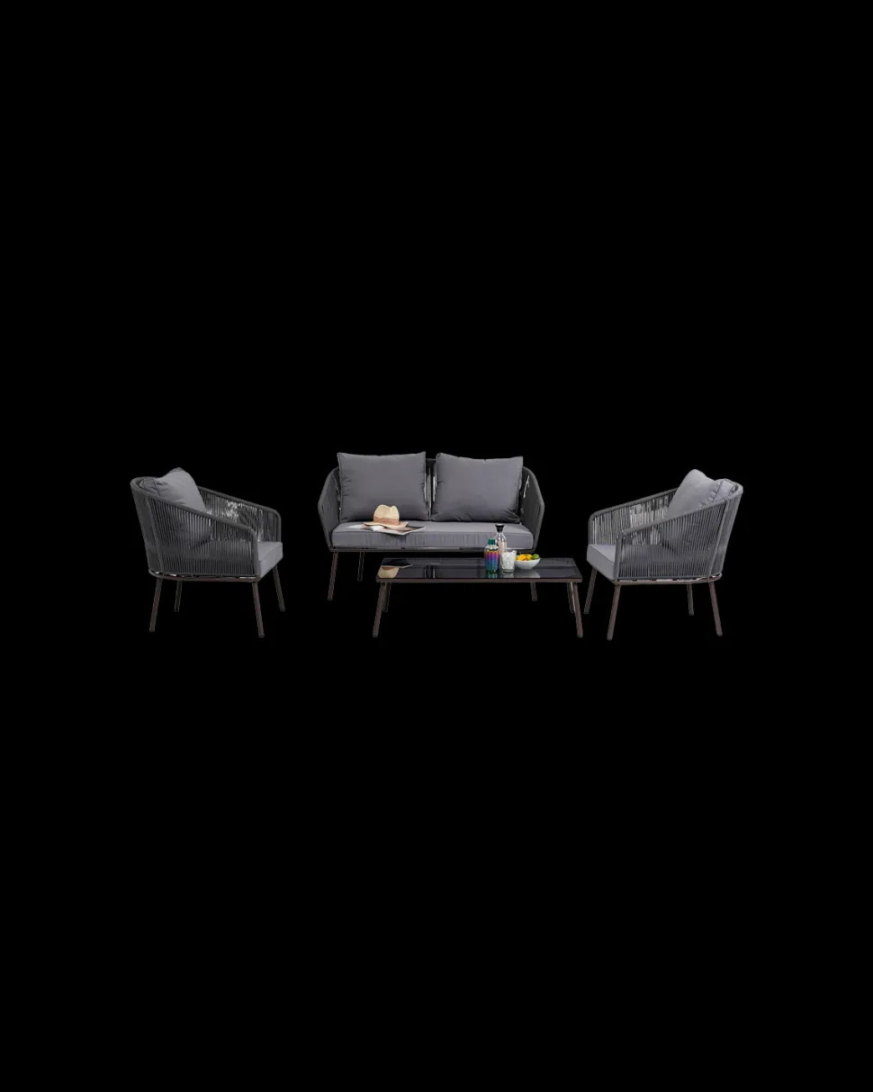 Sættet består af en 2 personers sofa, to lænestole og et rektangulært sofabord. Det luftige fletdesign skaber visuel lethed, mens de komfortable ryg- og sædehynder giver en indbydende og afslappet siddeoplevelse.