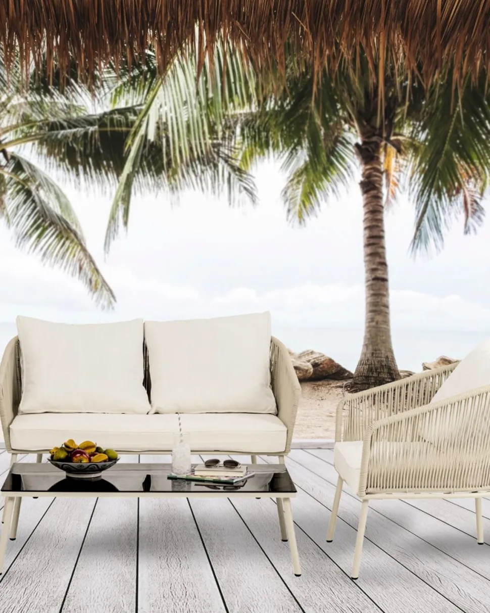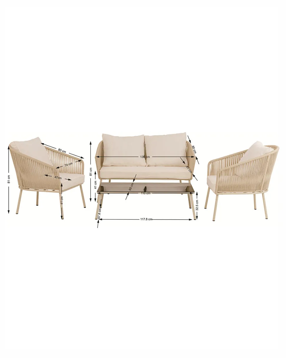 Sættet består af en 2 personers sofa, to lænestole og et rummeligt sofabord. Den luftige flet på ryglænene giver et elegant og let udtryk, mens de komfortable hynder i tidløs greige sikrer en behagelig loungeoplevelse – perfekt til lange sommeraftener.